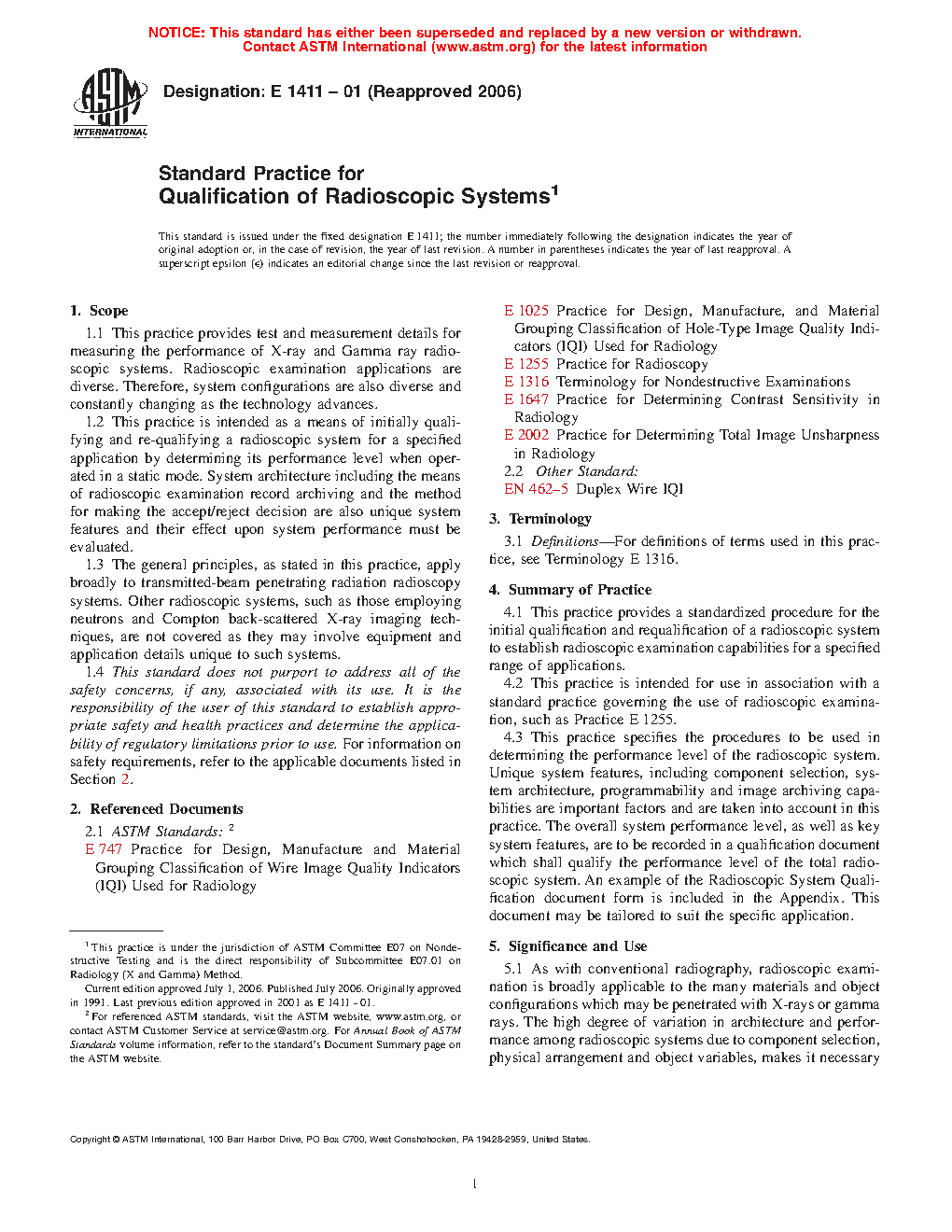1.2.1 The requirements of this practice and Practice E1255 shall be used together. The requirements of Practice E1255 provide the minimum requirements for radioscopic examination of materials. This practice is intended as a means of initially qualifying and re-qualifying a radioscopic system for a specified application by determining its performance when operated in a static or dynamic mode. Re-qualification may require agreement between the cognizant engineering organization and the supplier, or specific direction from the cognizant engineering organization and should be addressed in the purchase order or the contract.