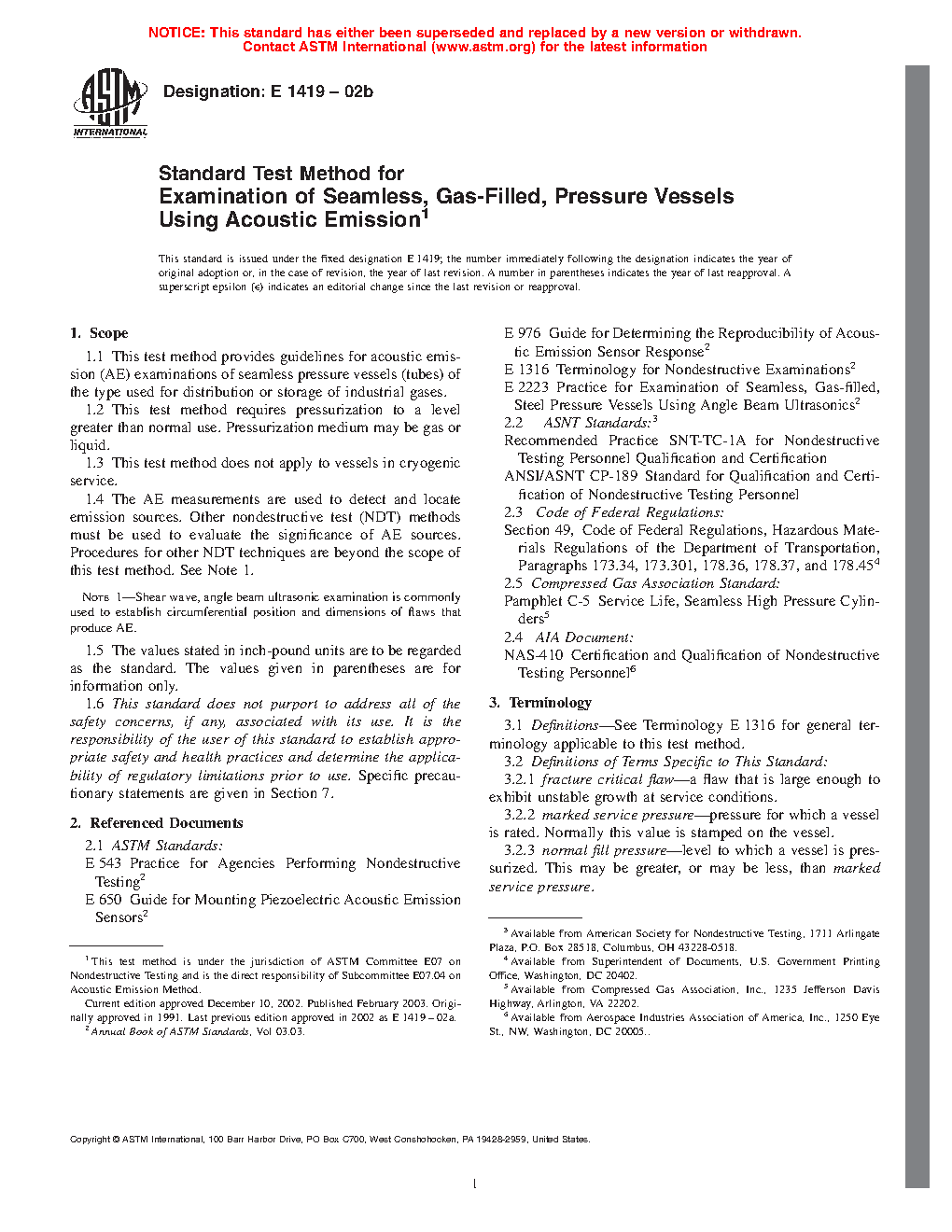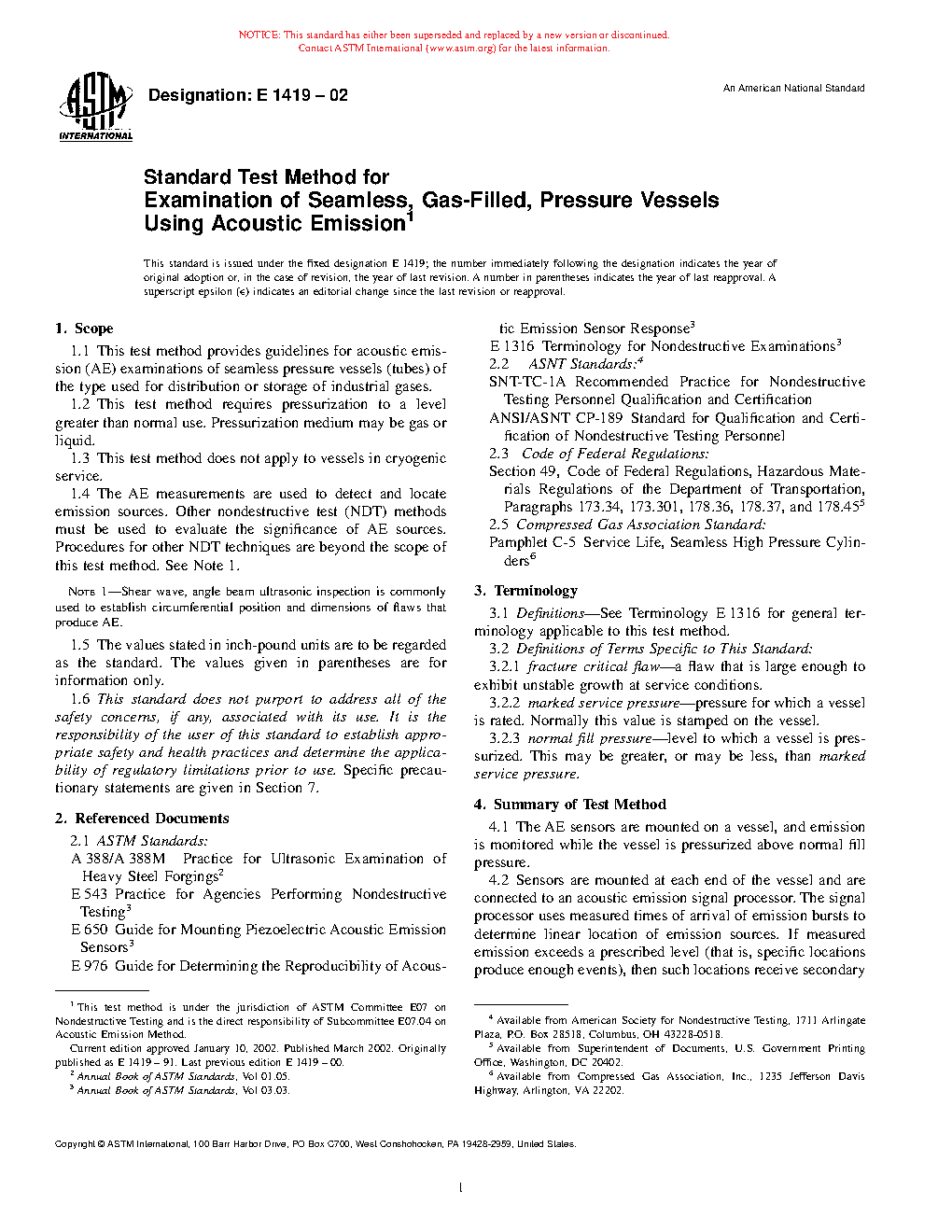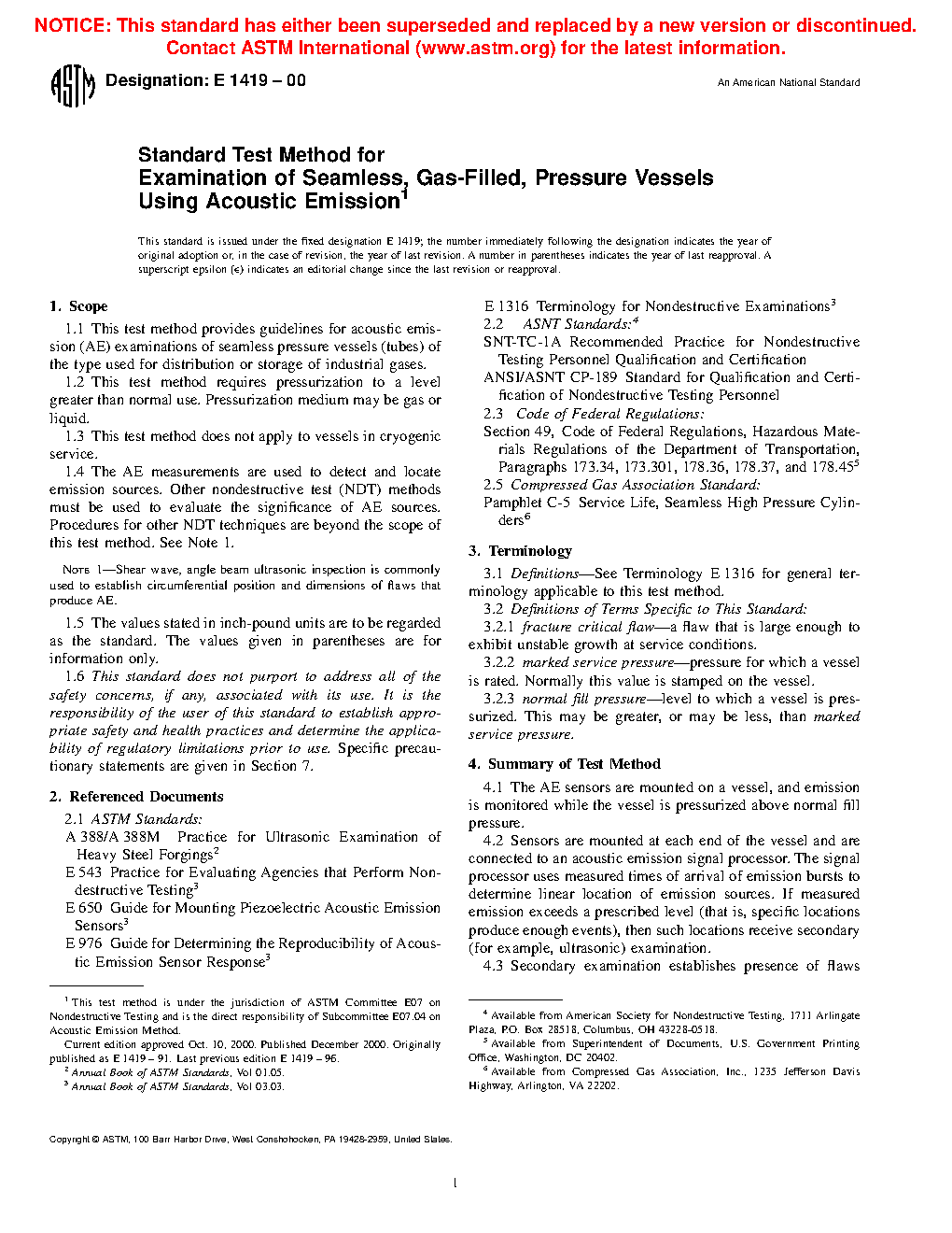 1.4 The AE measurements are used to detect and locate emission sources. Other nondestructive test (NDT) methods must be used to evaluate the significance of AE sources. Procedures for other NDT techniques are beyond the scope of this practice. See Note 1.