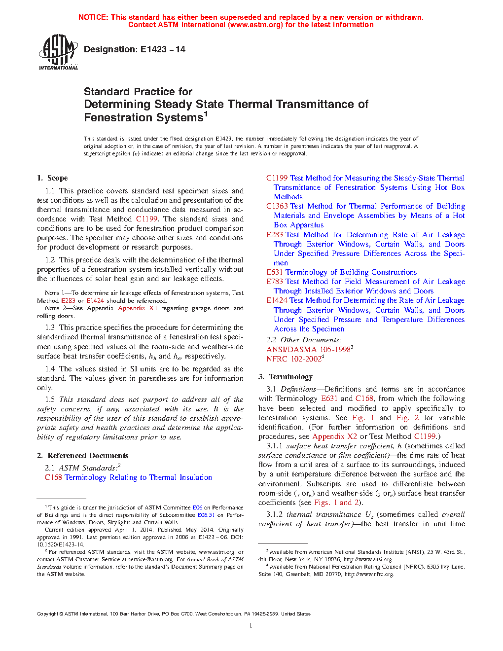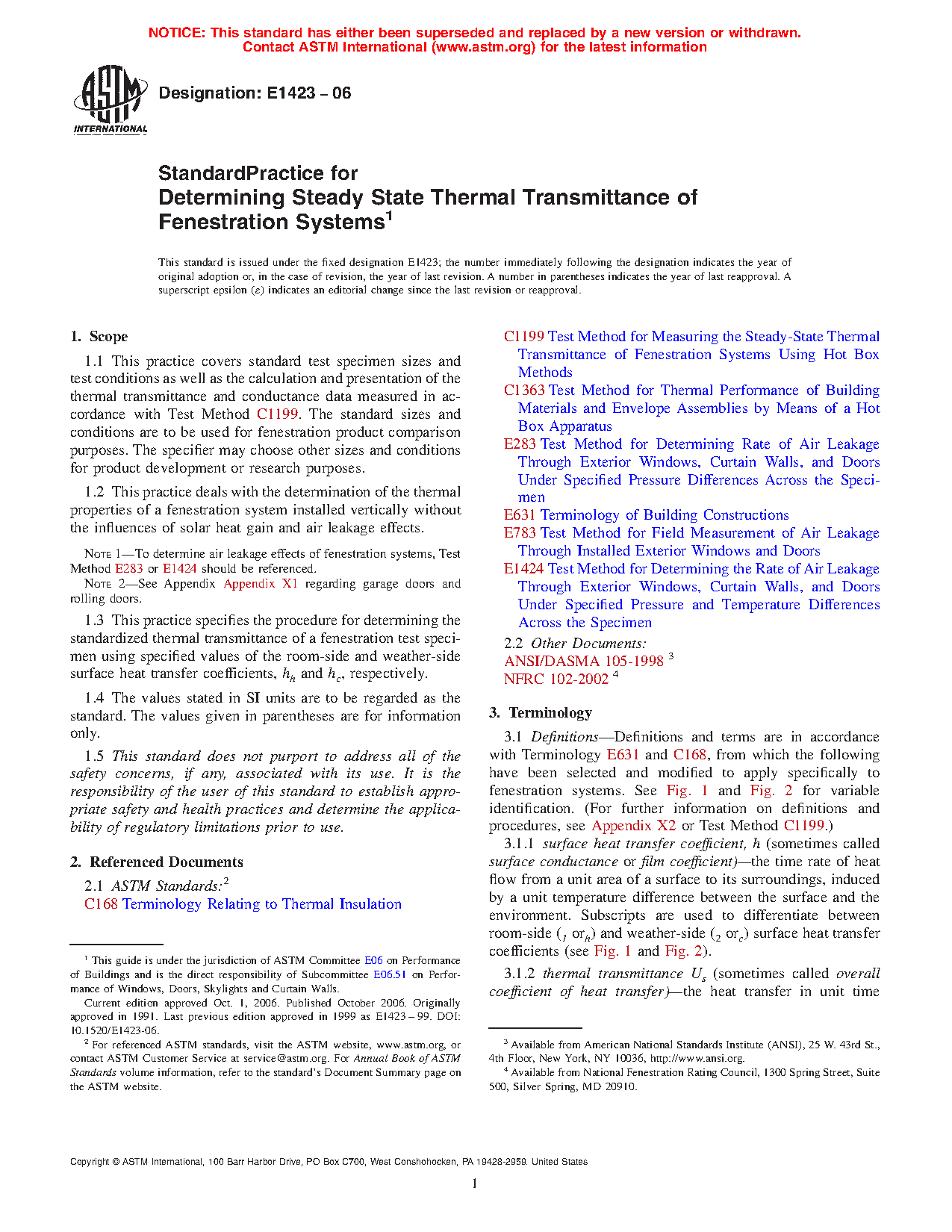 1.3 This practice specifies the procedure for determining the standardized thermal transmittance of a fenestration test specimen using specified values of the room-side and weather-side surface heat transfer coefficients, hh and hc, respectively.