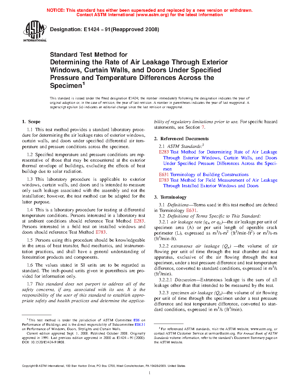 1.1 This test method provides a standard laboratory procedure for determining the air leakage rates of exterior windows, curtain walls, and doors under specified differential air temperature and pressure conditions across the specimen.