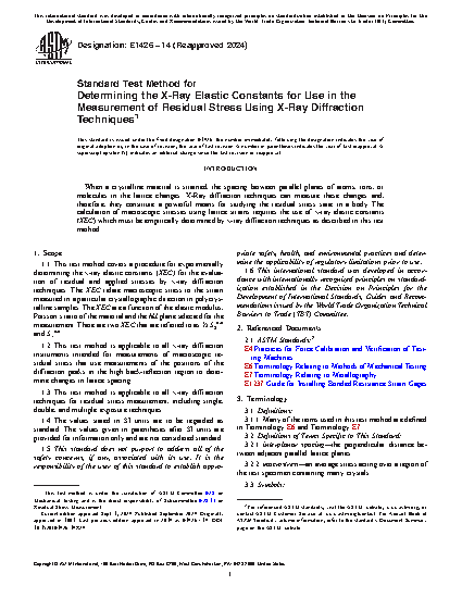 1.1 This test method covers a procedure for experimentally determining the x-ray elastic constants (XEC) for the evaluation of residual and applied stresses by x-ray diffraction techniques. The XEC relate macroscopic stress to the strain measured in a particular crystallographic direction in polycrystalline samples. The XEC are a function of the elastic modulus, Poisson’s ratio of the material and the hkl plane selected for the measurement. There are two XEC that are referred to as 1/2 S2hkl and S1 hkl.