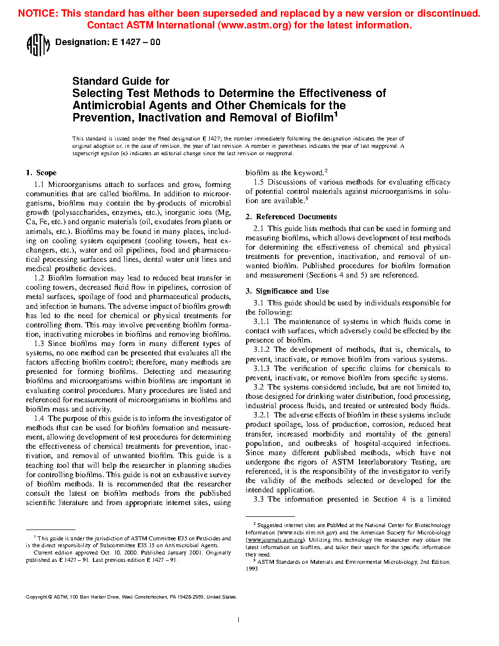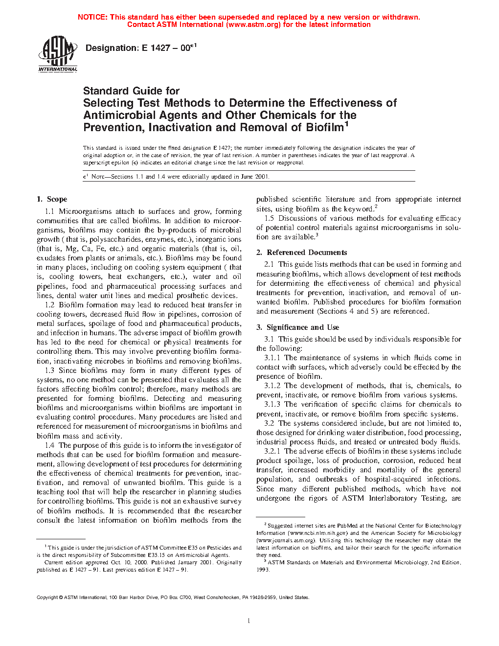 1.4 The purpose of this guide is to inform the investigator of methods that can be used for biofilm formation and measurement, allowing development of test procedures for determining the effectiveness of chemical treatments for prevention, inactivation, and removal of unwanted biofilm. This guide is a teaching tool that will help the researcher in planning studies for controlling biofilms. This guide is not an exhaustive survey of biofilm methods. It is recommended that the researcher consult the latest information on biofilm methods from the published scientific literature and from appropriate internet sites, using biofilm as the keyword.
