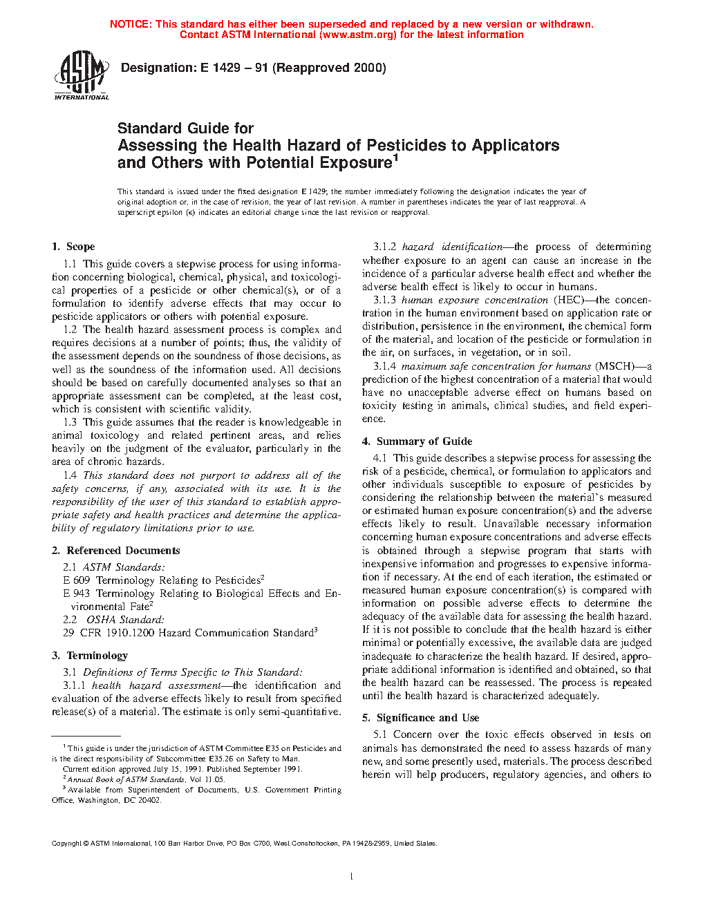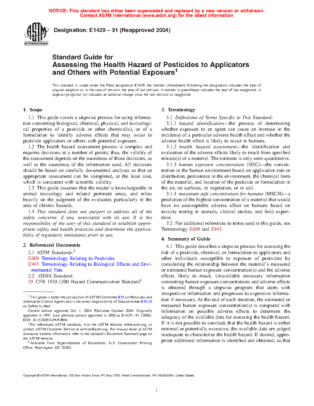 1.1 This guide covers a stepwise process for using information concerning biological, chemical, physical, and toxicological properties of a pesticide or other chemical(s), or of a formulation to identify adverse effects that may occur to pesticide applicators or others with potential exposure.