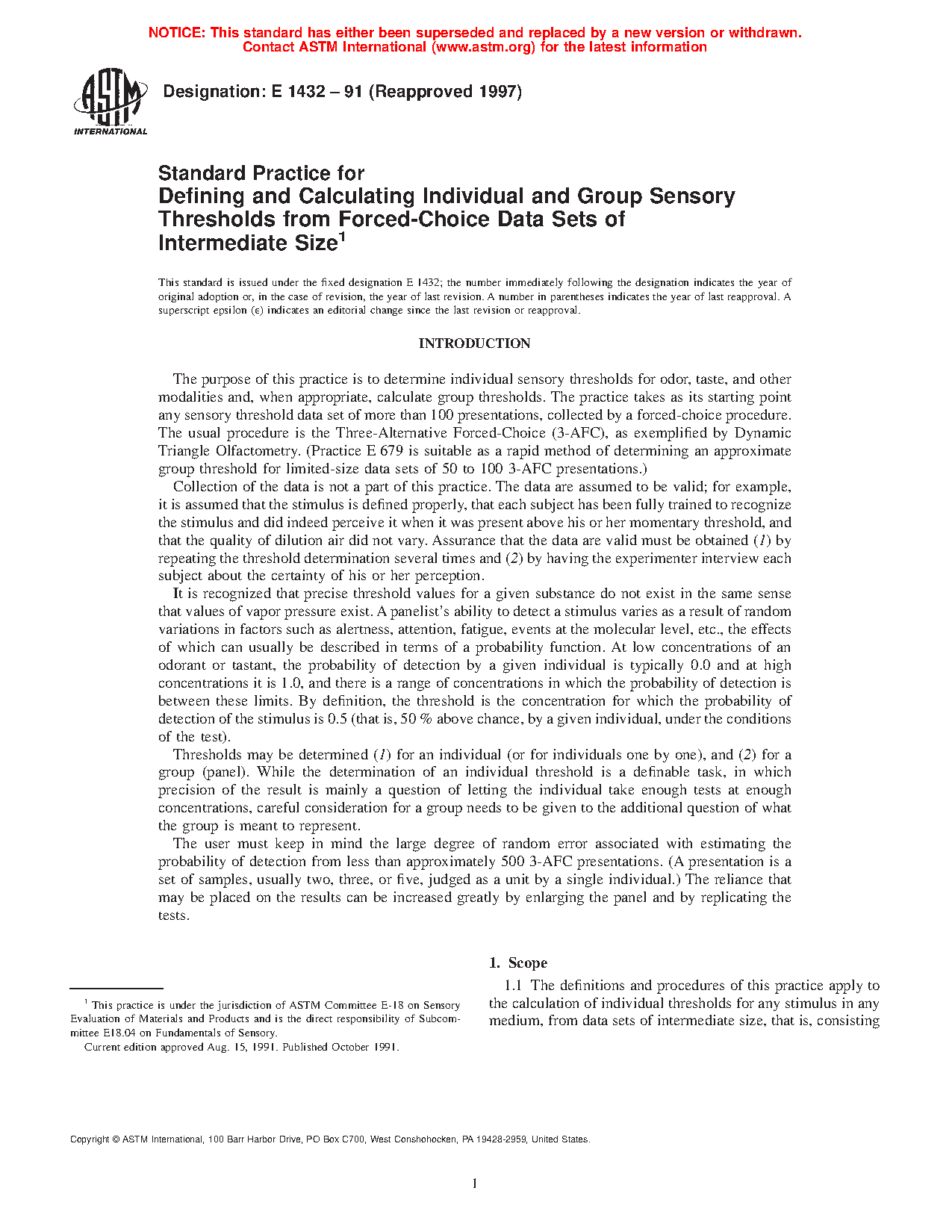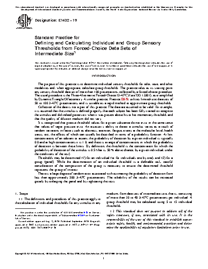 1.1 The definitions and procedures of this practice apply to the calculation of individual thresholds for any stimulus in any medium, from data sets of intermediate size, that is, consisting of more than 20 to 40 3-AFC presentations per individual. A group threshold may be calculated using 5 to 15 individual thresholds.