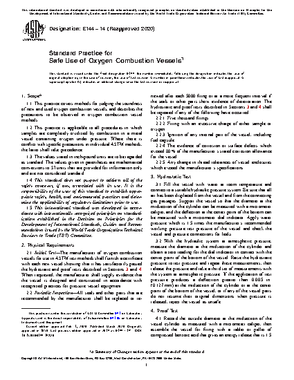 1.1 This practice covers methods for judging the soundness of new and used oxygen combustion vessels, and describes the precautions to be observed in oxygen combustion vessel methods.