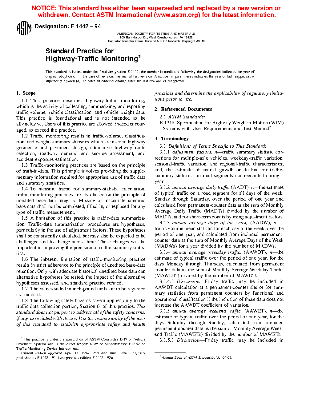 1.1 This practice describes highway-traffic monitoring, which is the activity of collecting, summarizing, and reporting traffic volume, vehicle classification, and vehicle weight data. This practice is foundational and is not intended to be all-inclusive. Users of this practice are allowed, indeed encouraged, to exceed the practice.