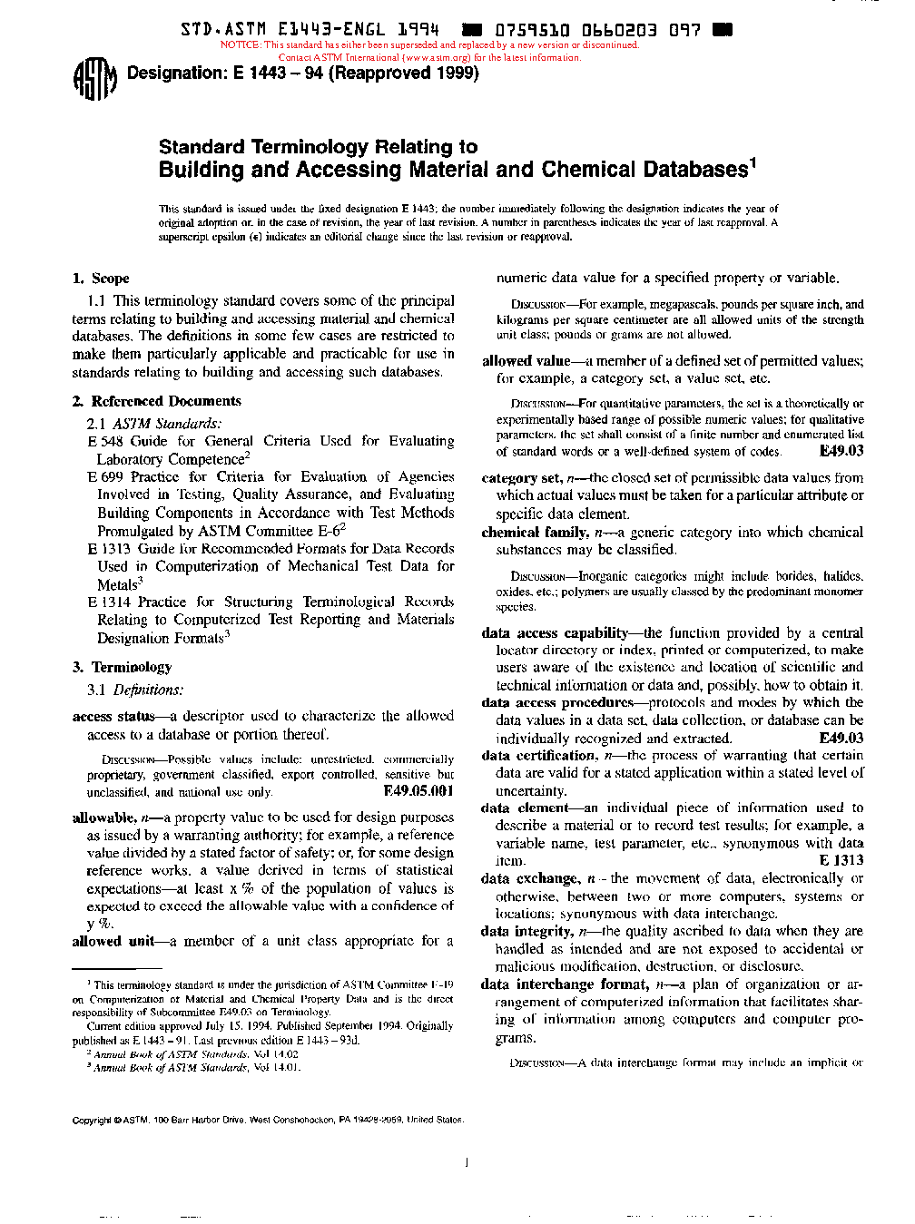 1.1 This terminology standard covers some of the principal terms relating to building and accessing material and chemical databases. The definitions in some few cases are restricted to make them particularly applicable and practicable for use in standards relating to building and accessing such databases.