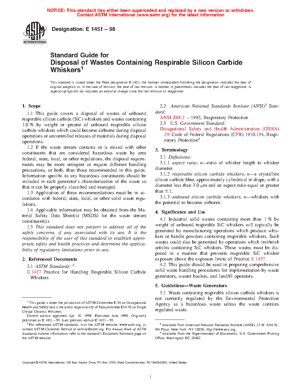 1.1 This standard offers a guide for safe disposal of wastes of unbound silicon carbide whiskers and fibers and wastes containing 1.0% by weight or greater of unbound silicon carbide whiskers and fibers, which could become airborne during disposal operations or uncontrolled releases of materials during disposal operations. Silicon carbide whiskers are not naturally occurring, and such waste could only be generated during the manufacture of silicon carbide whiskers or their composites.