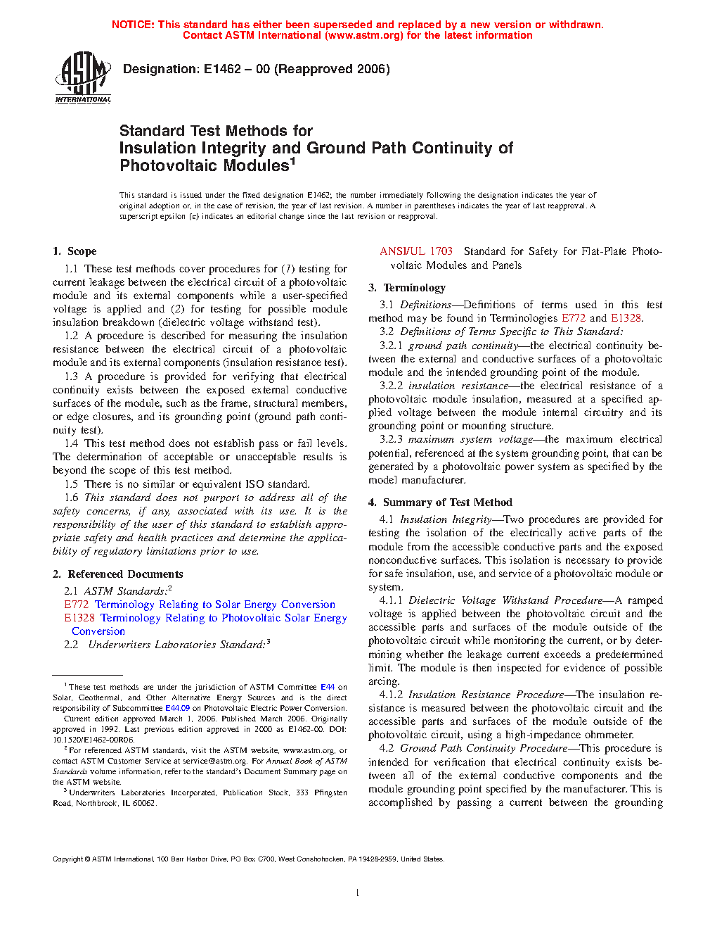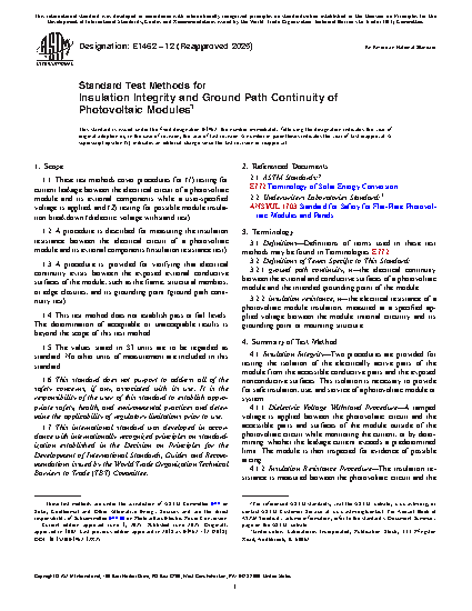 1.1 These test methods cover procedures for (1) testing for current leakage between the electrical circuit of a photovoltaic module and its external components while a user-specified voltage is applied and (2) for testing for possible module insulation breakdown (dielectric voltage withstand test).