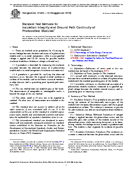 1.2 A procedure is described for measuring the insulation resistance between the electrical circuit of a photovoltaic module and its external components (insulation resistance test).