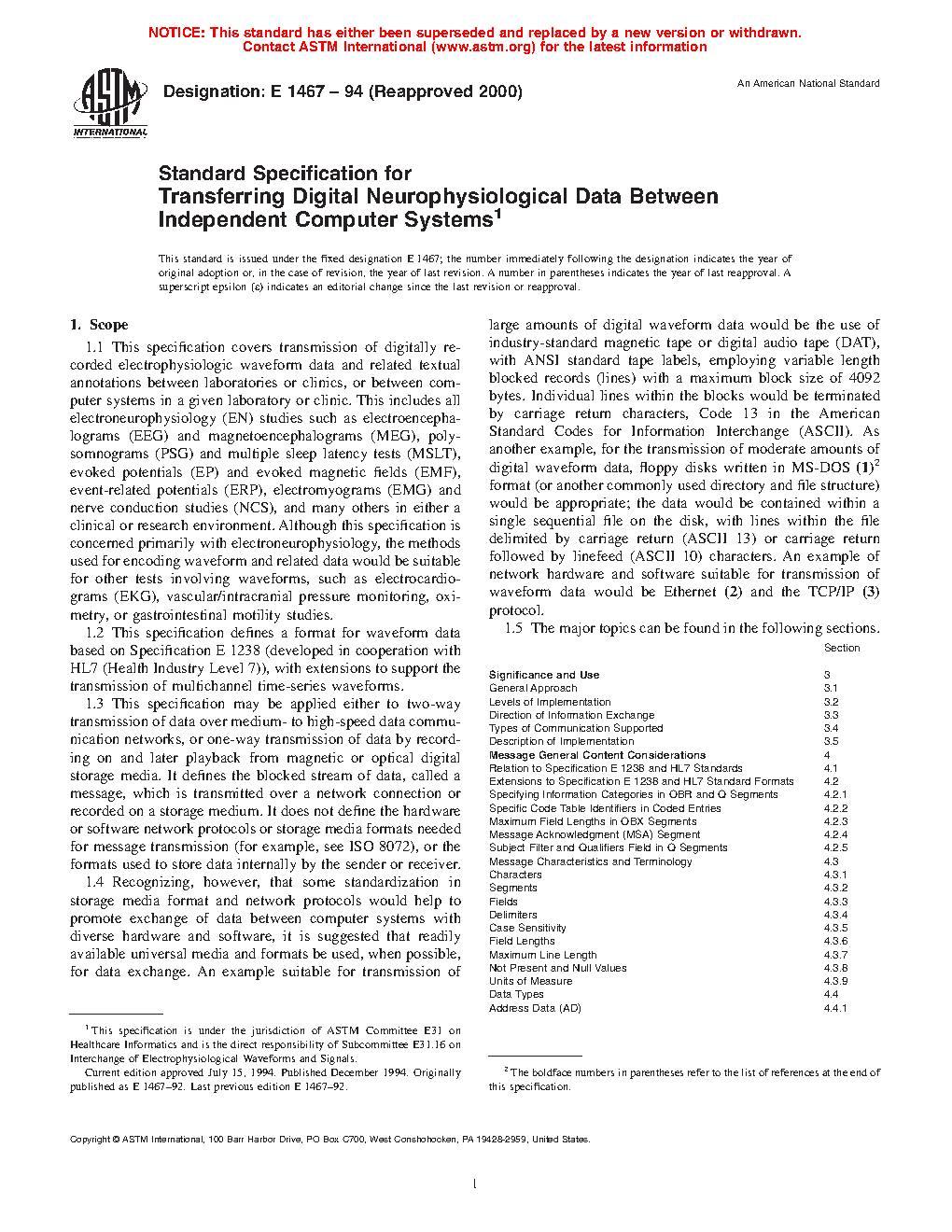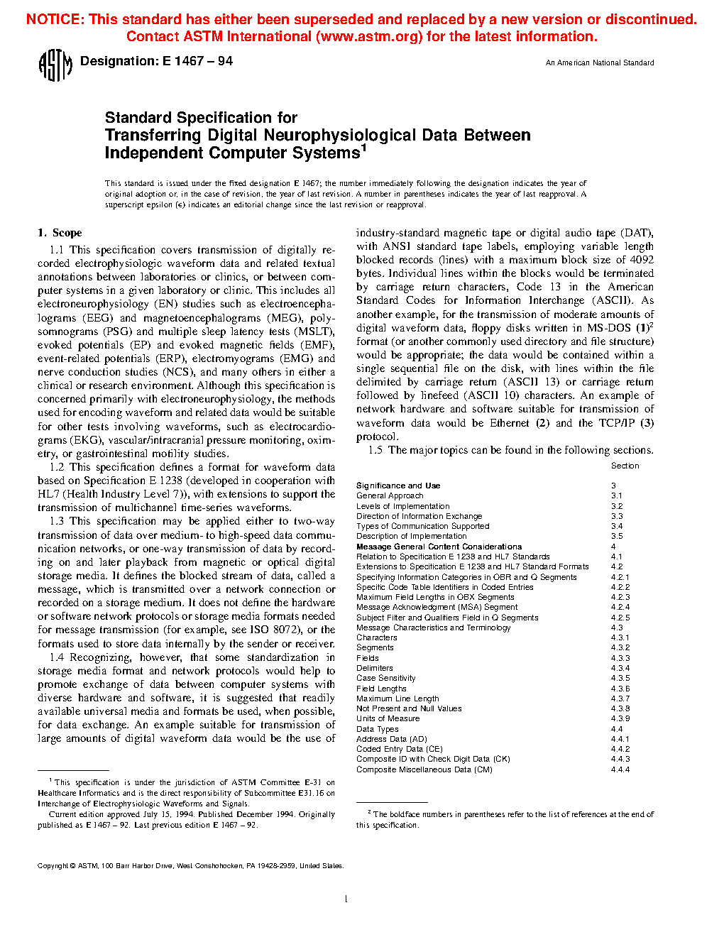 1.2 This specification defines a format for waveform data based on Specification E 1238 (developed in cooperation with HL7 (Health Industry Level 7)), with extensions to support the transmission of multichannel time-series waveforms.