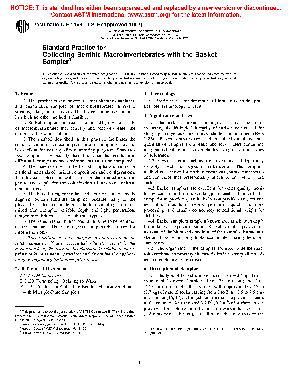 1.5 The basket sampler can be used alone or can effectively augment bottom substrate sampling, because many of the physical variables encountered in bottom sampling are minimized (for example, variable depth and light penetration, temperature differences, and substrate types).