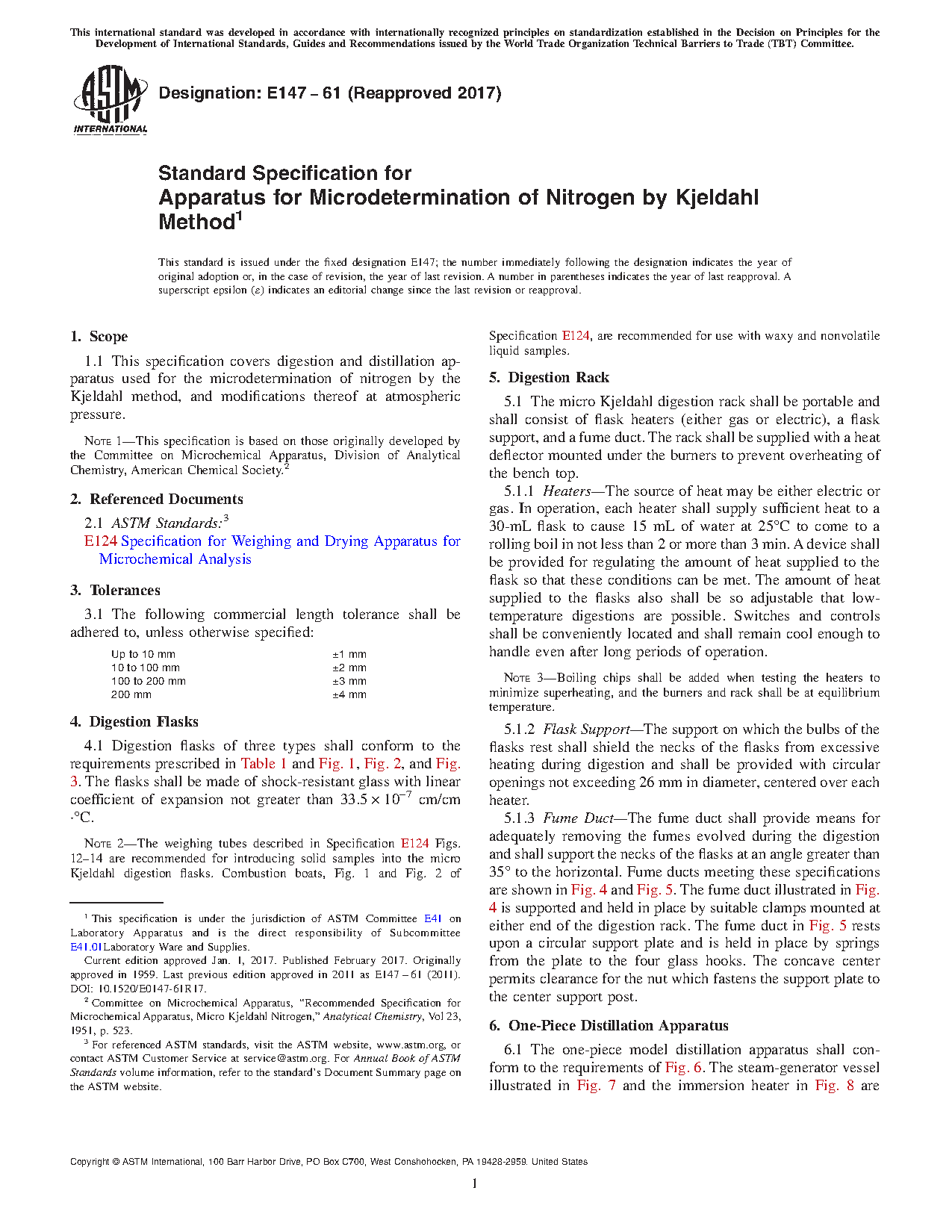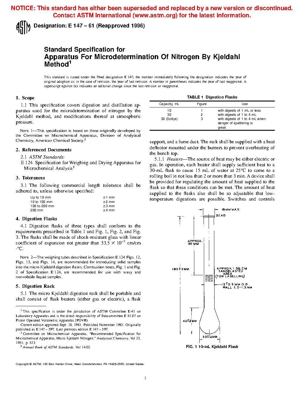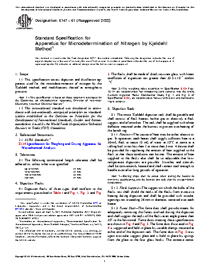 This specification covers the design and dimensional requirements for the digestion and distillation apparatus used for the microdetermination of nitrogen by the Kjeldahl method, and modifications thereof at atmospheric pressure. This apparatus is comprised primarily of digestion flasks, micro Kjeldahl digestion rack, one-piece model distillation apparatus, and Pregl (Parnas-Wagner) type distillation apparatus.