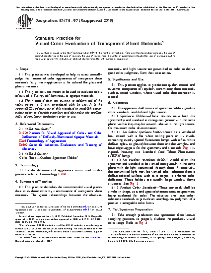 1.1 This practice was developed to help its users critically judge the transmitted color appearance of transparent sheet materials. Its primary application is for colored flat glass and plastic materials.