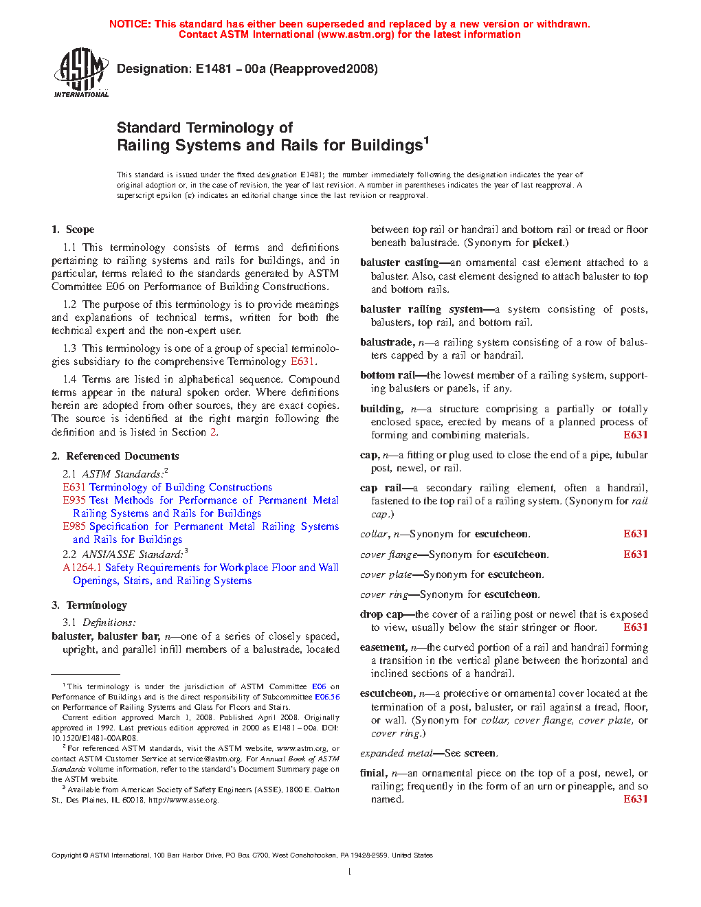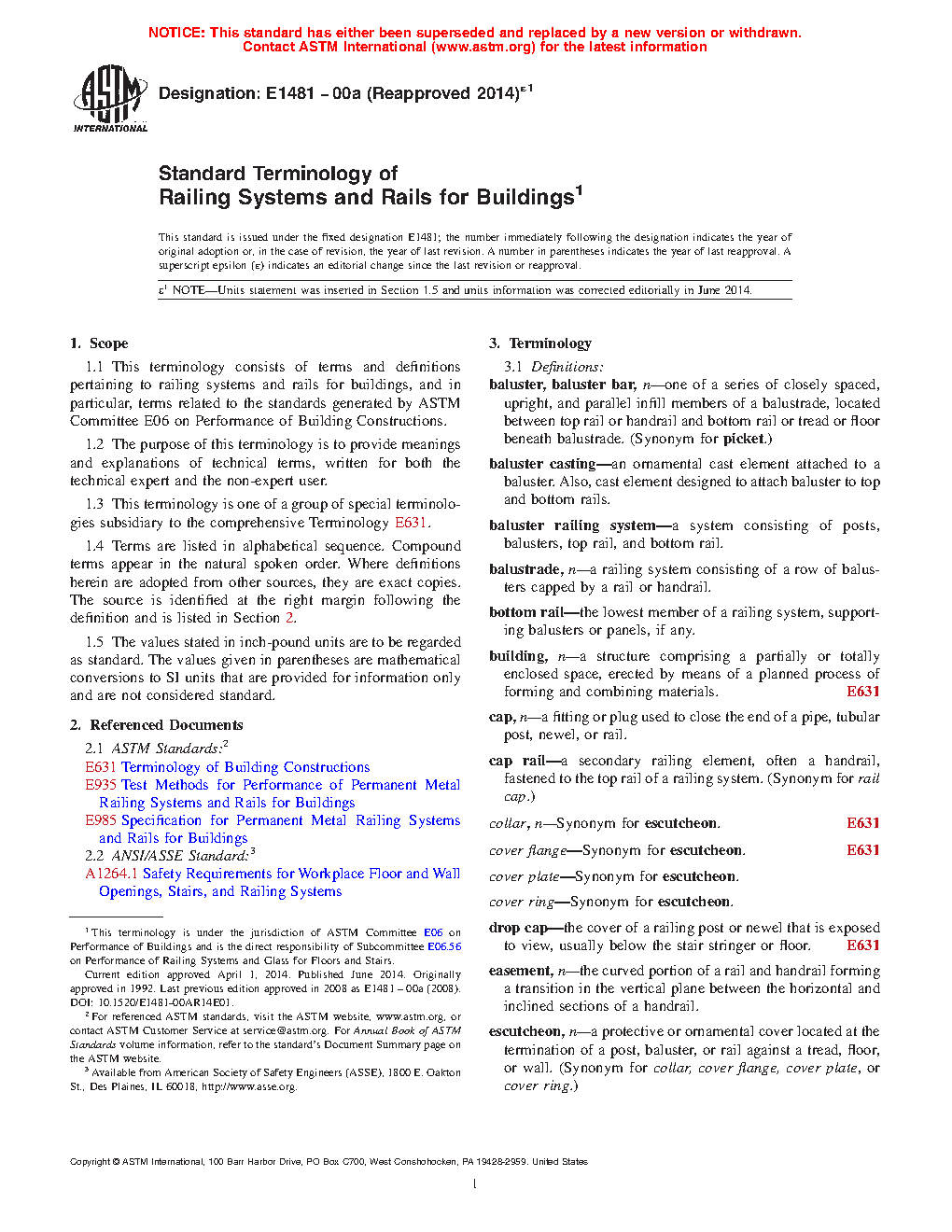 1.1 This terminology consists of terms and definitions pertaining to railing systems and rails for buildings, and in particular, terms related to the standards generated by ASTM Committee E06 on Performance of Building Constructions.