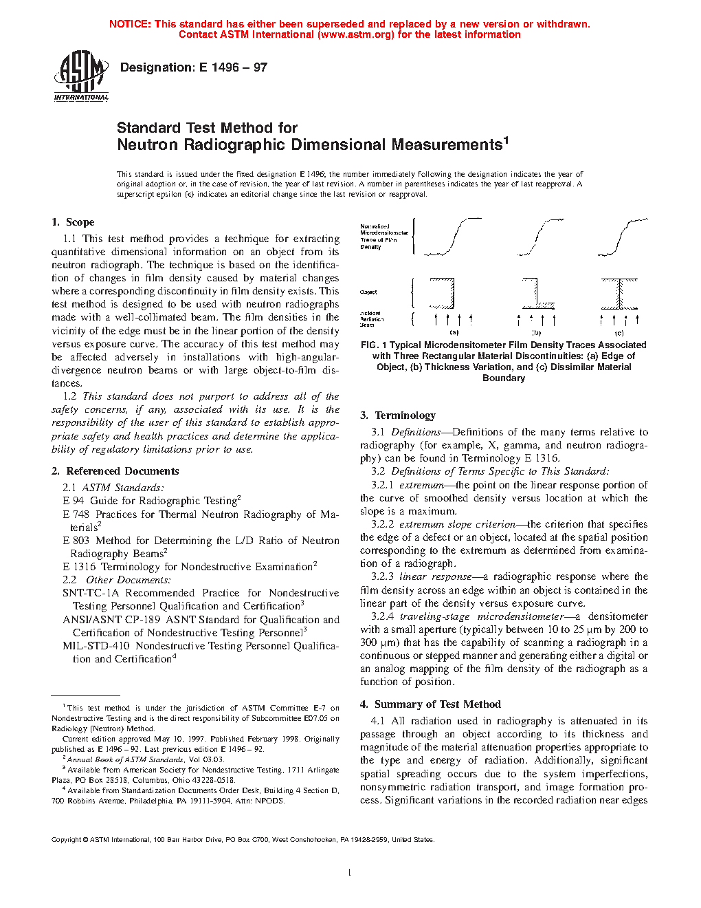 1.1 This test method provides a technique for extracting quantitative dimensional information on an object from its neutron radiograph. The technique is based on the identification of changes in film density caused by material changes where a corresponding discontinuity in film density exists. This test method is designed to be used with neutron radiographs made with a well-collimated beam. The film densities in the vicinity of the edge must be in the linear portion of the density versus exposure curve. The accuracy of this test method may be affected adversely in installations with high-angular-divergence neutron beams or with large object-to-film distances.