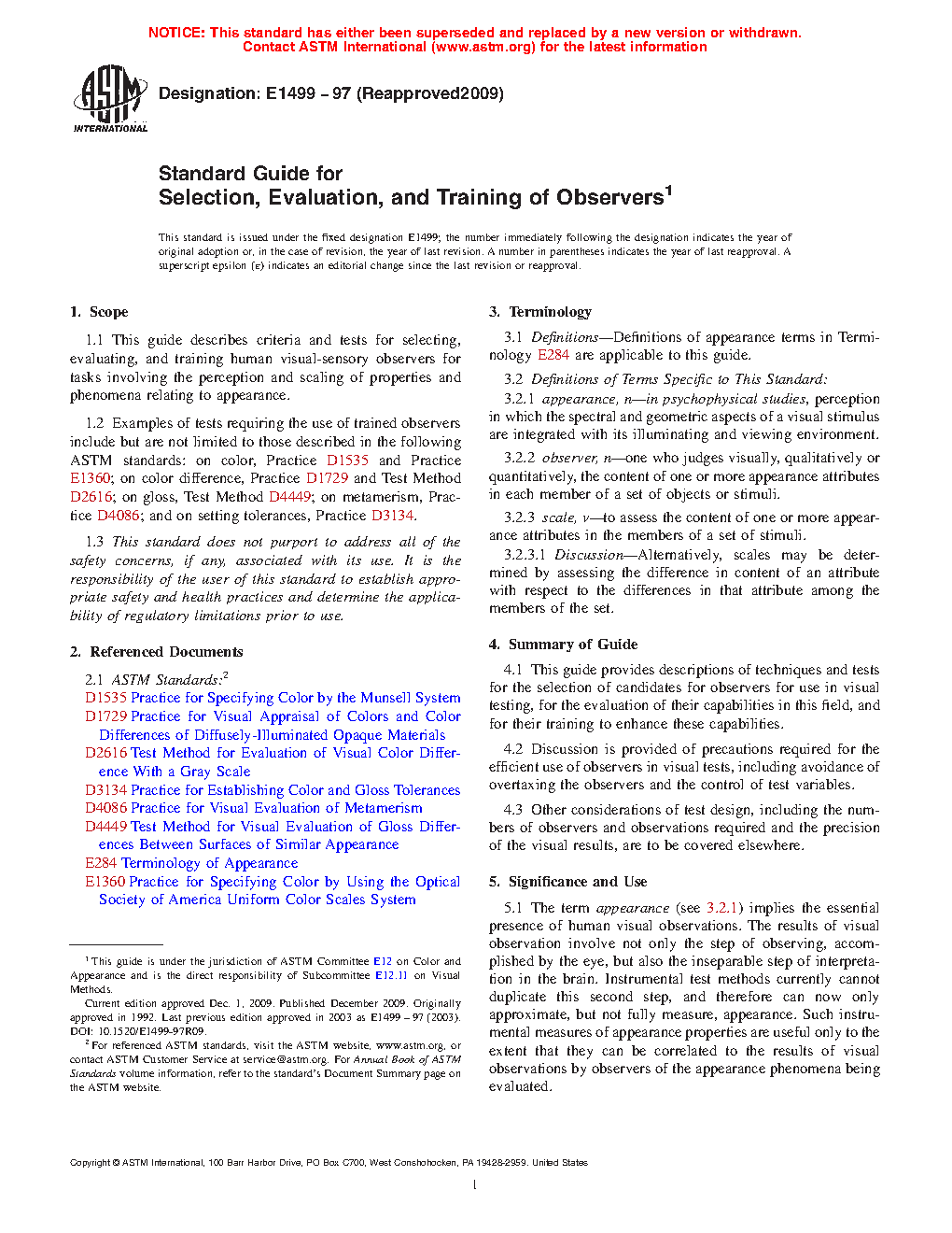 1.1 This guide describes criteria and tests for selecting, evaluating, and training human visual-sensory observers for tasks involving the perception and scaling of properties and phenomena relating to appearance.