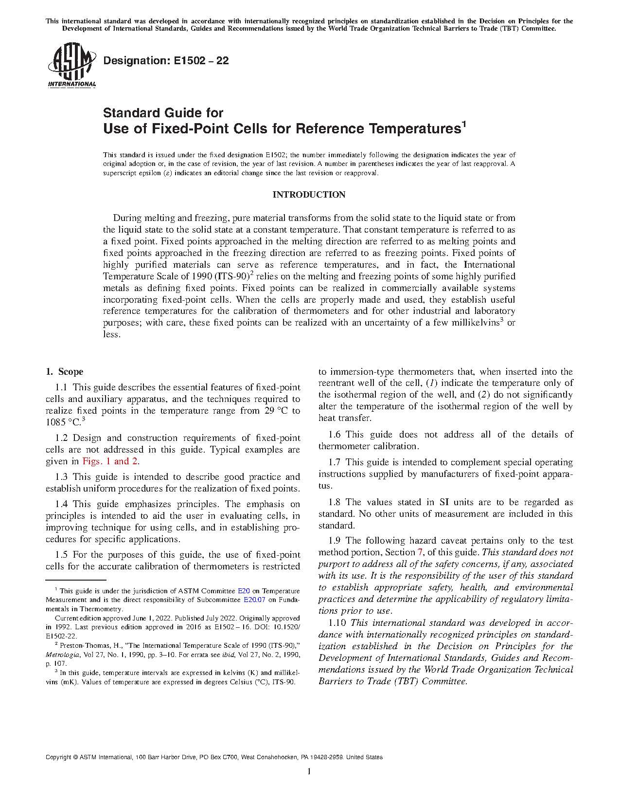 1.1 This guide describes the essential features of fixed-point cells and auxiliary apparatus, and the techniques required to realize fixed points in the temperature range from 29 °C to 1085 °C.3
