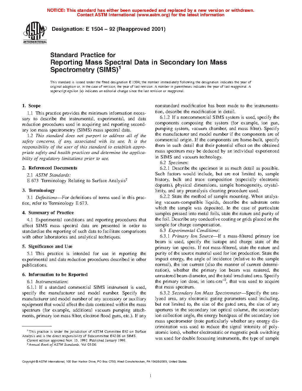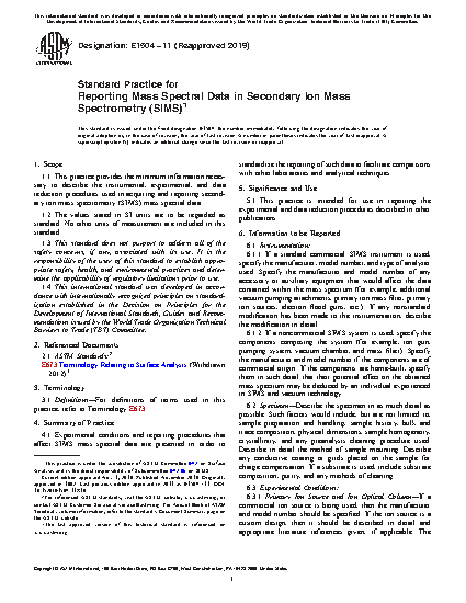1.1 This practice provides the minimum information necessary to describe the instrumental, experimental, and data reduction procedures used in acquiring and reporting secondary ion mass spectrometry (SIMS) mass spectral data.