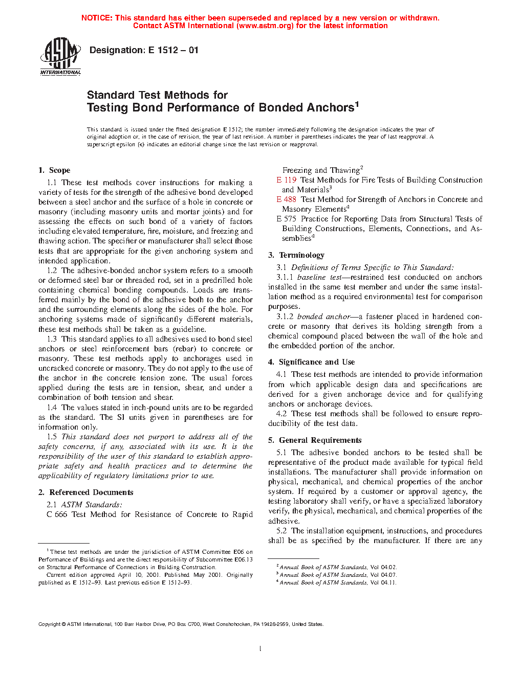 These test methods are intended to provide information from which applicable design data and specifications are derived for a given anchorage device and for qualifying anchors or anchorage devices.