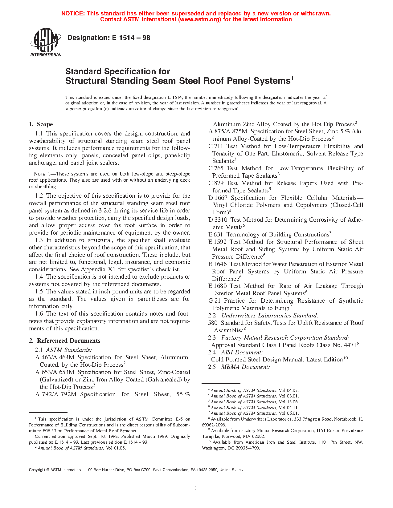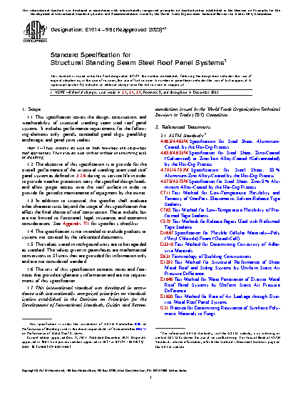 1.1 This specification covers the design, construction, and weatherability of structural standing seam steel roof panel systems. It includes performance requirements for the following elements only: panels, concealed panel clips, panel/clip anchorage, and panel joint sealers.