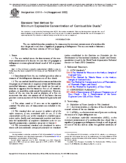 1.1 This test method covers the determination of the minimum concentration of a dust-air mixture that will propagate a deflagration in a near-spherical closed vessel of 20 L or greater volume.