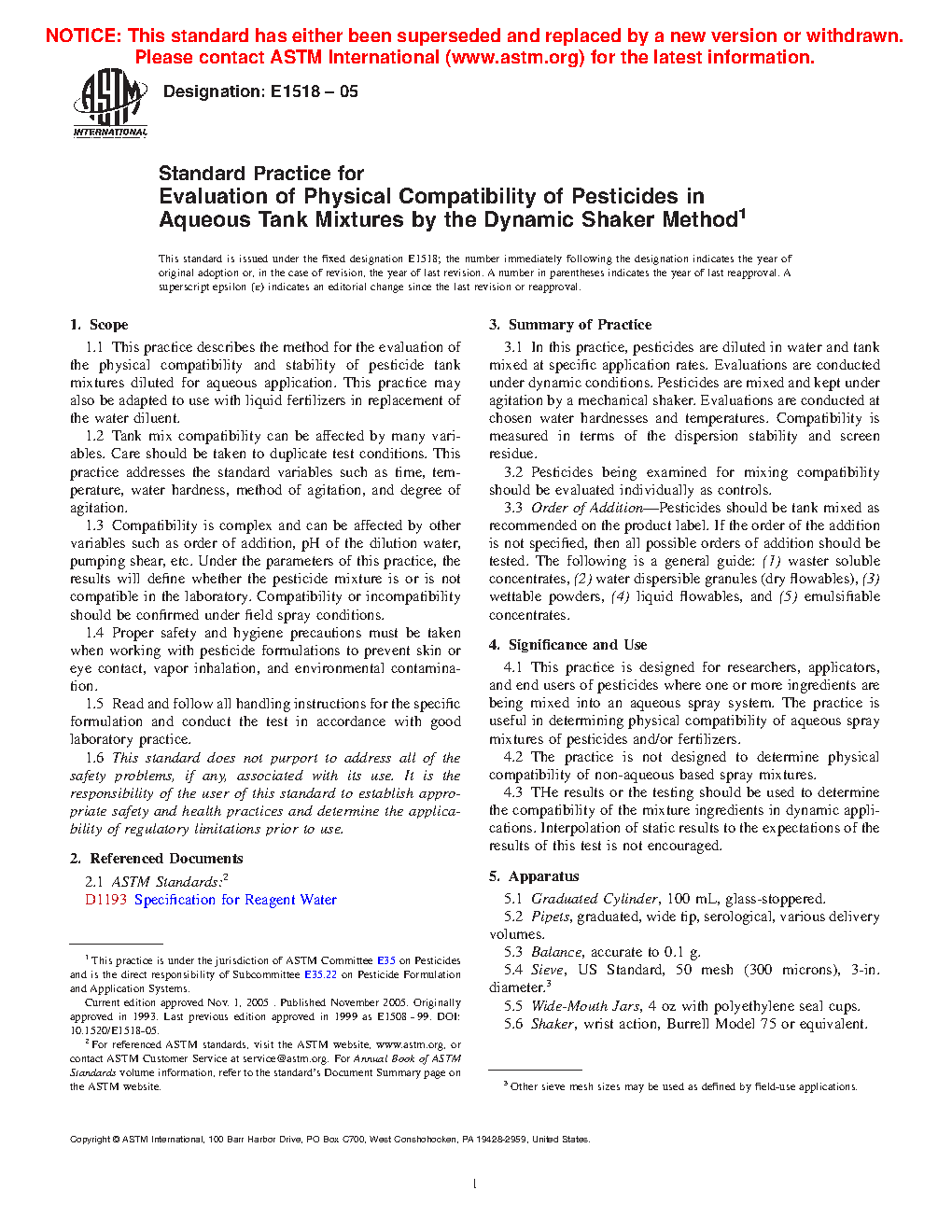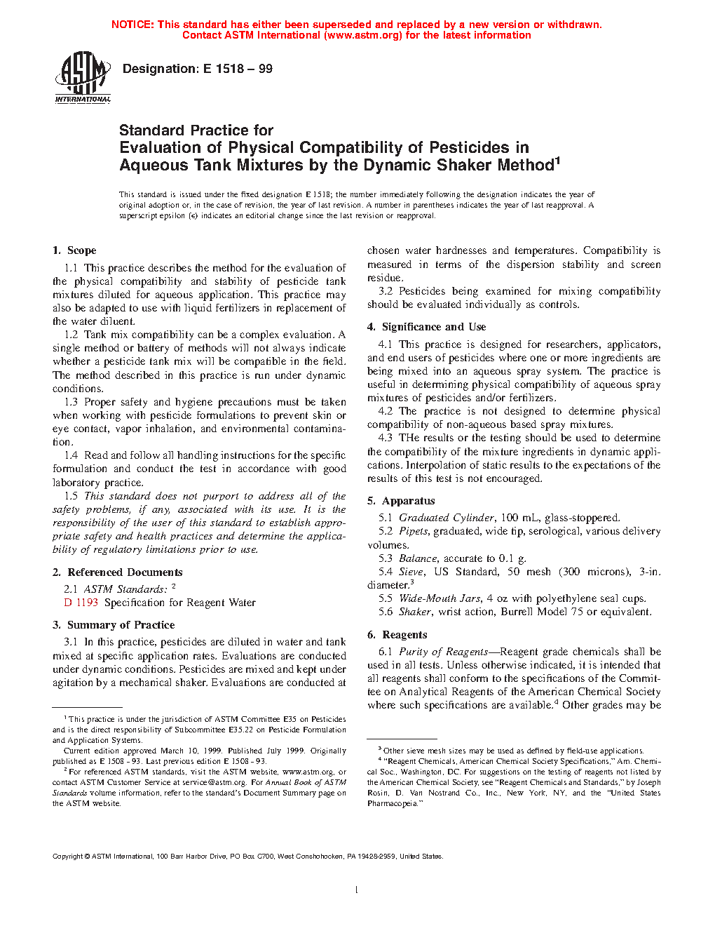 1.2 Tank mix compatibility can be a complex evaluation. A single method or battery of methods will not always indicate whether a pesticide tank mix will be compatible in the field. The method described in this practice is run under dynamic conditions.