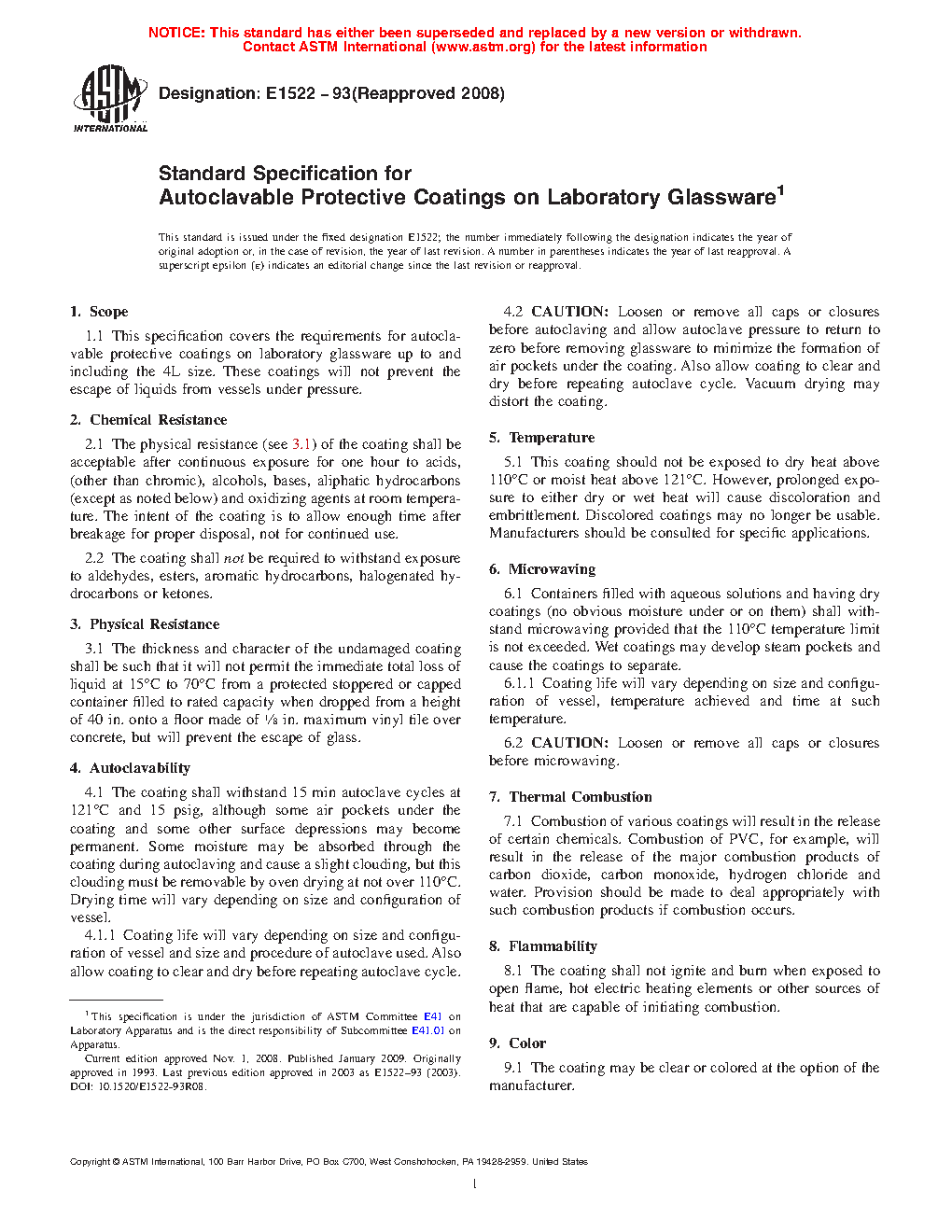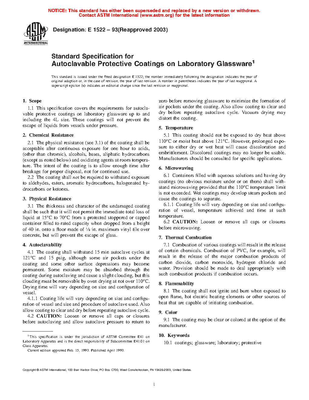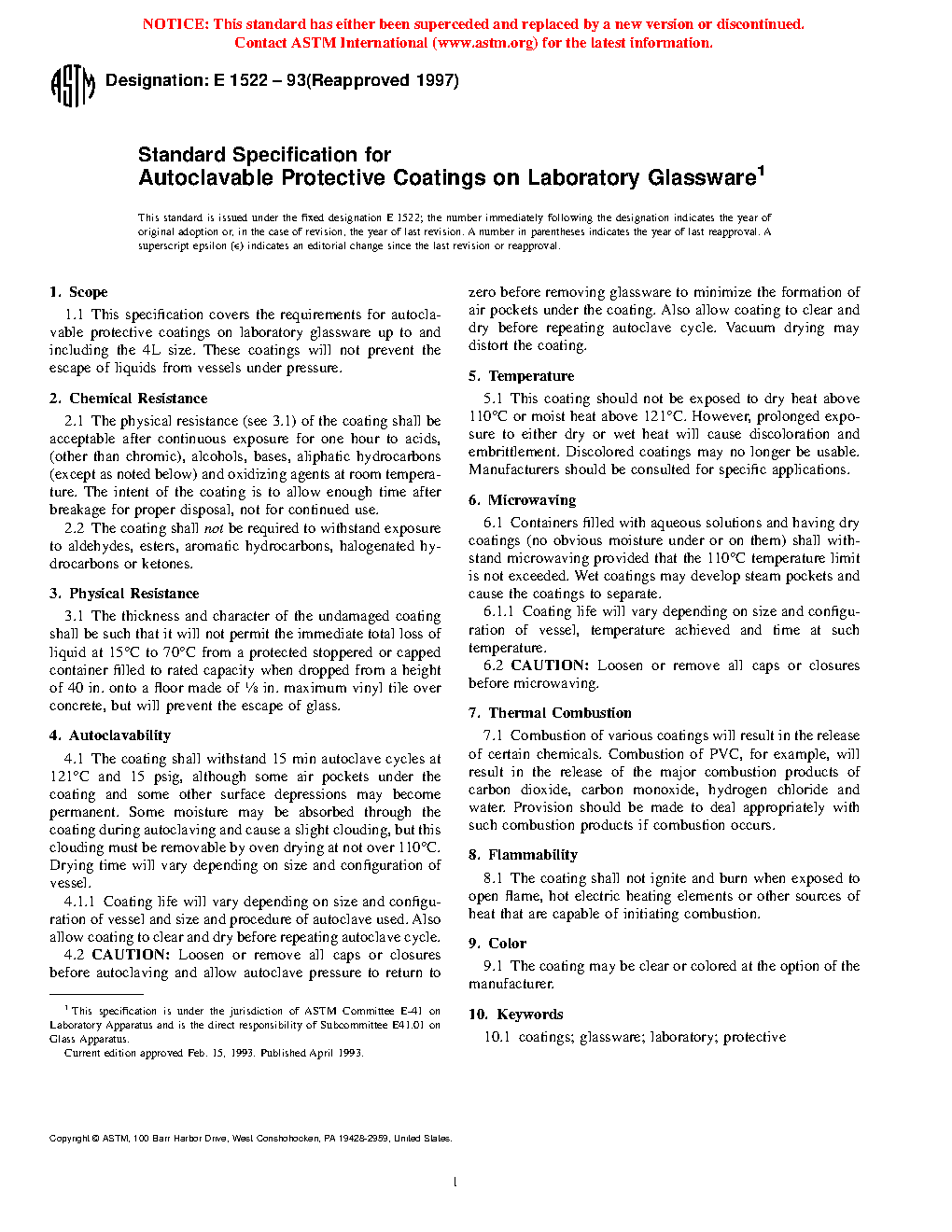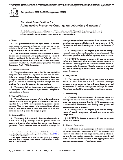 1.1 This specification covers the requirements for autoclavable protective coatings on laboratory glassware up to and including the 4L size. These coatings will not prevent the escape of liquids from vessels under pressure.