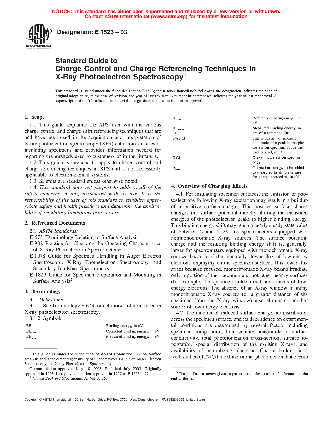 No ideal method has been developed to deal with surface charging (3, 4). For insulators, an appropriate choice of any control or referencing system will depend on the nature of the specimen, the instruments, and the information needed. The appropriate use of charge control and referencing techniques will result in more consistent, reproducible data. Researchers are strongly urged to report both the control and referencing techniques that have been used, the specific peaks and binding energies used as standards (if any), and the criteria applied in determining optimum results so that the appropriate comparisons may be made.