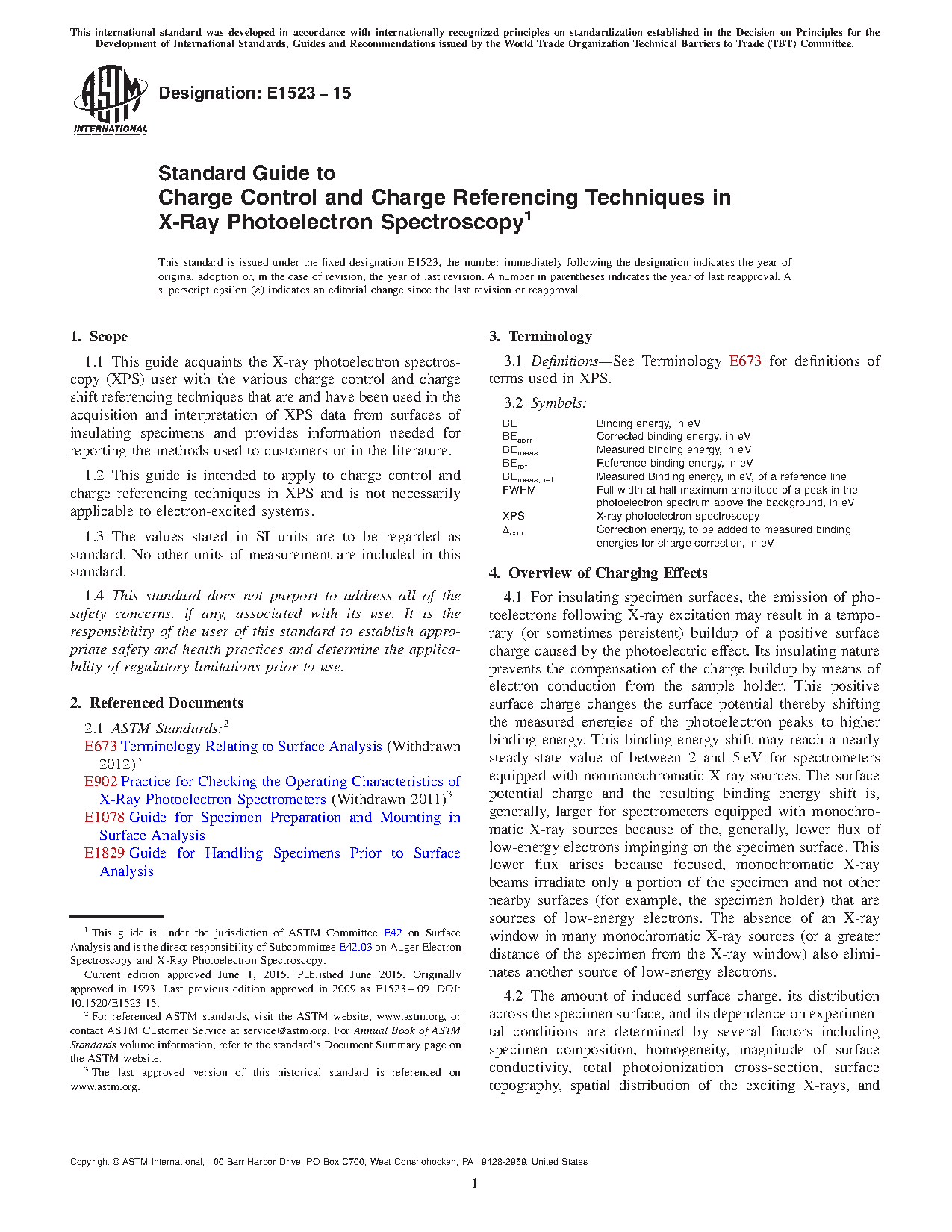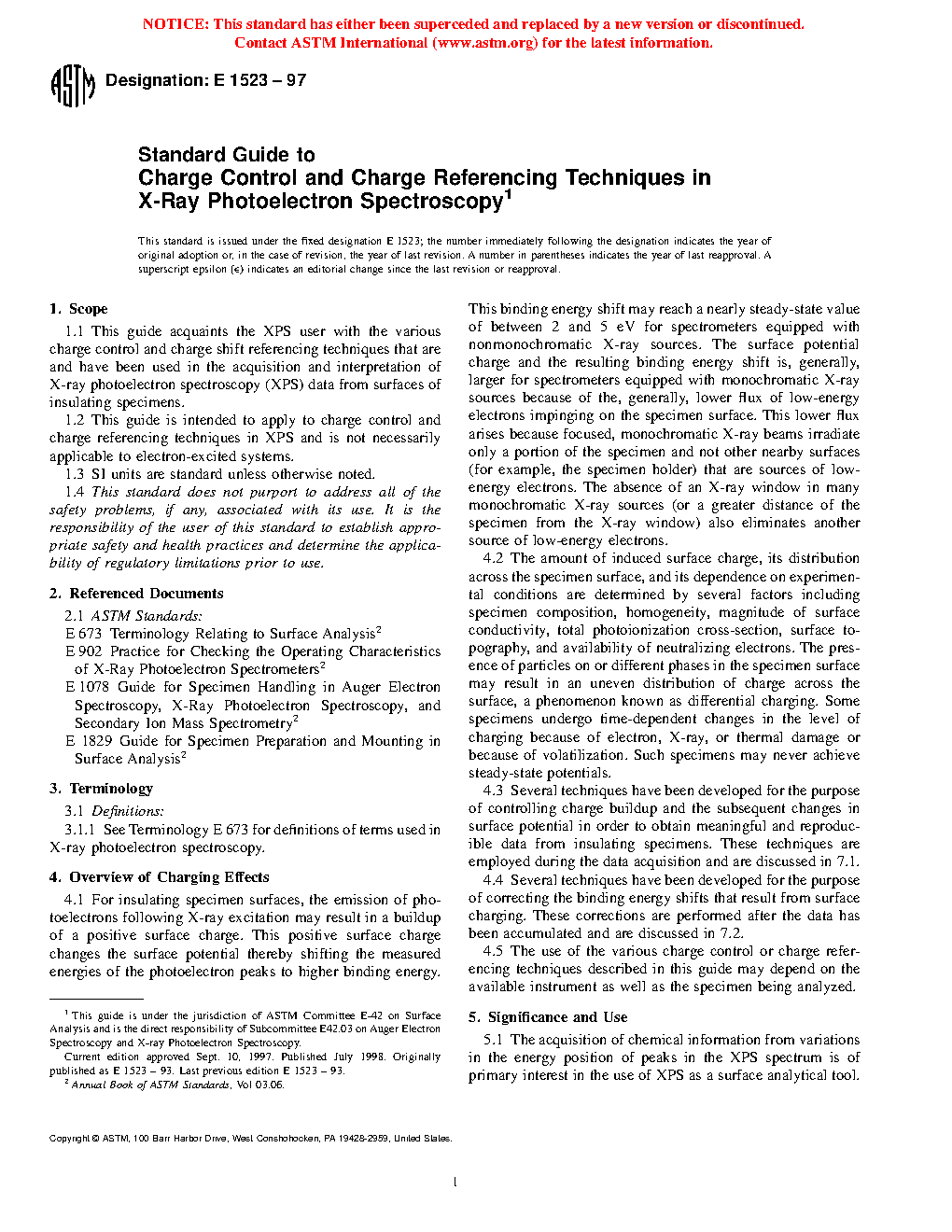 5.2 Although highly reliable methods have now been developed to stabilize surface potentials during XPS analysis of most materials (5, 6), no single method has been developed to deal with surface charging in all circumstances (10, 11). For insulators, an appropriate choice of any control or referencing system will depend on the nature of the specimen, the instruments, and the information needed. The appropriate use of charge control and referencing techniques will result in more consistent, reproducible data. Researchers are strongly urged to report both the control and referencing techniques that have been used, the specific peaks and binding energies used as standards (if any), and the criteria applied in determining optimum results so that the appropriate comparisons may be made.