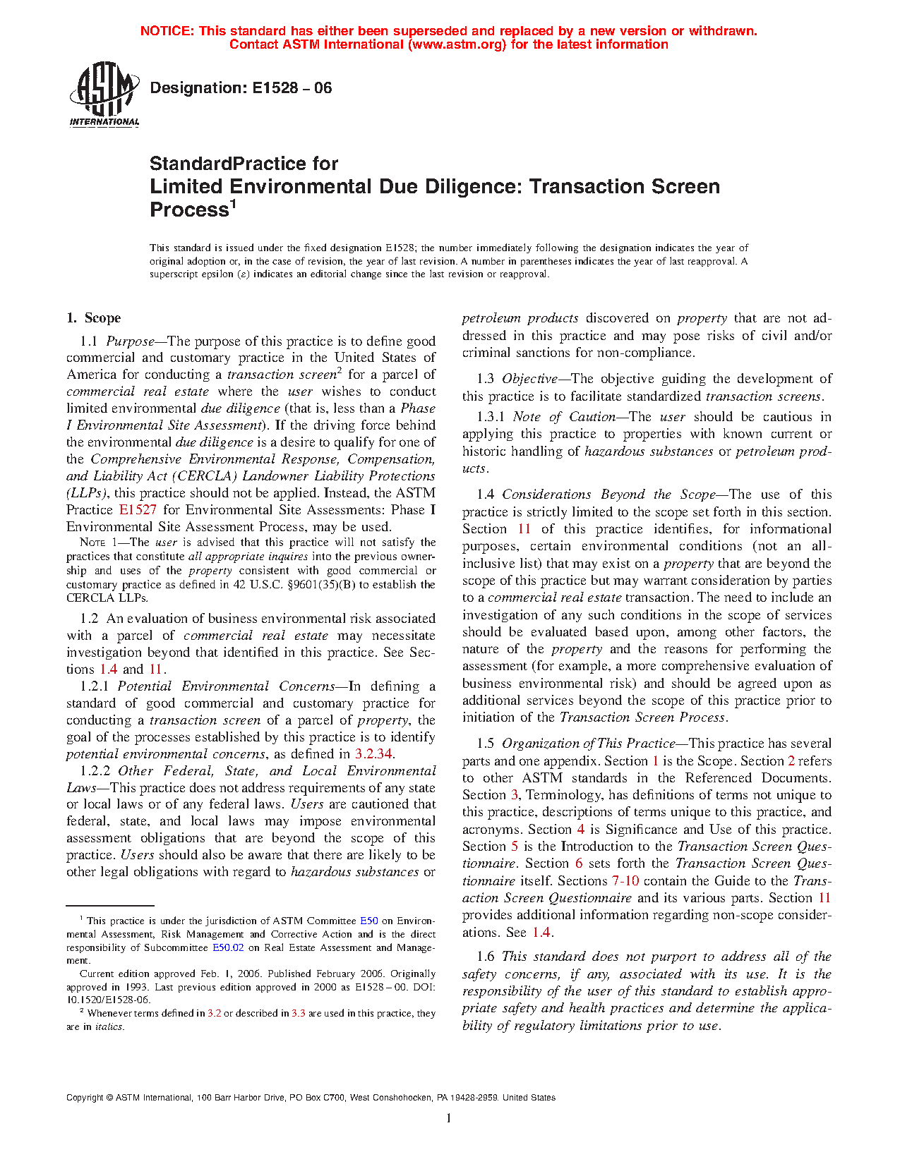 1.1 Purpose—The purpose of this practice is to define a good practice in the United States of America for conducting a transaction screen2 for a parcel of commercial real estate where the user wishes to conduct limited environmental due diligence (that is, less than a Phase I Environmental Site Assessment). If the driving force behind the environmental due diligence is a desire to qualify for one of the Comprehensive Environmental Response, Compensation, and Liability Act (CERCLA) Landowner Liability Protections (LLPs), this practice should not be applied. Instead, the ASTM E1527: Standard Practice for Environmental Site Assessments: Phase I Environmental Site Assessment Process or ASTM E2247: Standard Practice for Environmental Site Assessments: Phase I Environmental Site Assessment Process for Forestland or Rural Property may be used.