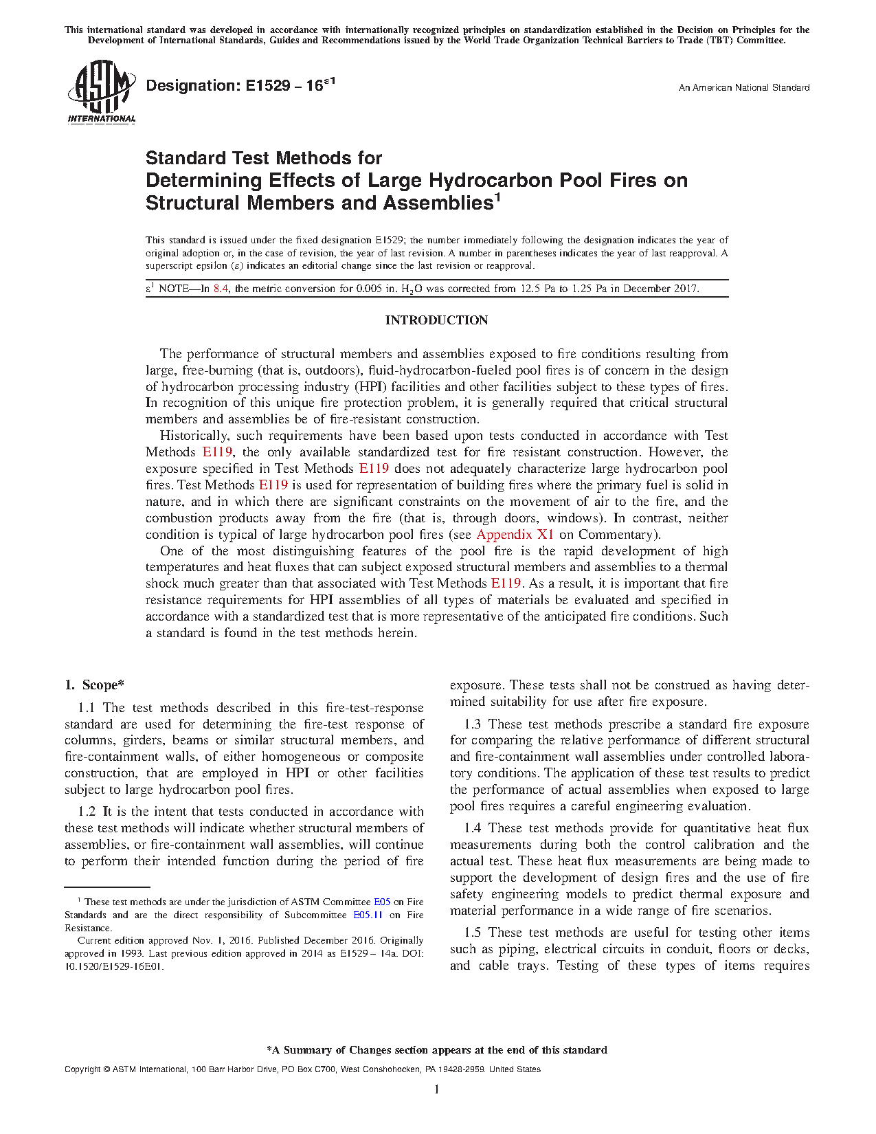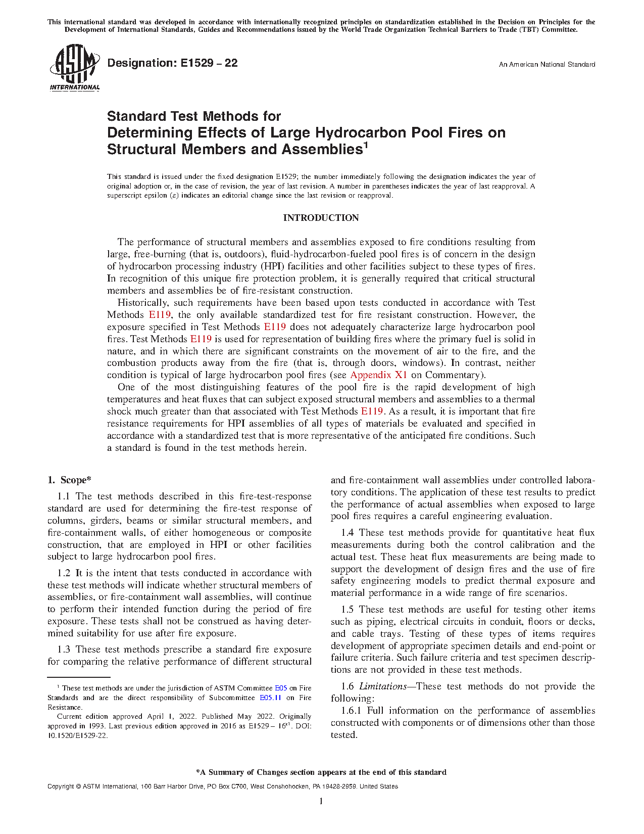 1.1 The test methods described in this fire-test-response standard are used for determining the fire-test response of columns, girders, beams or similar structural members, and fire-containment walls, of either homogeneous or composite construction, that are employed in HPI or other facilities subject to large hydrocarbon pool fires.