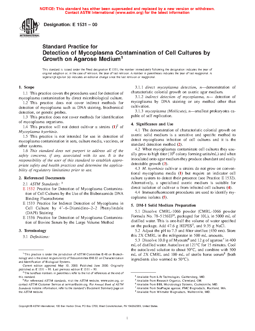 1.2 This practice does not cover indirect methods for detection of mycoplasma such as DNA staining, biochemical detection, or genetic probes.