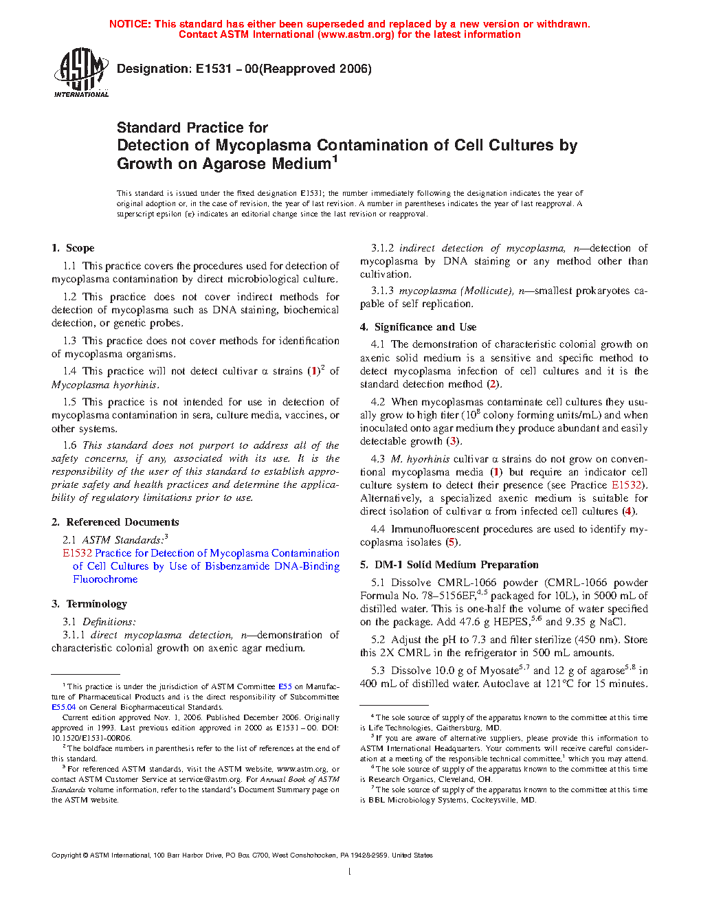 1.1 This practice covers the procedures used for detection of mycoplasma contamination by direct microbiological culture.