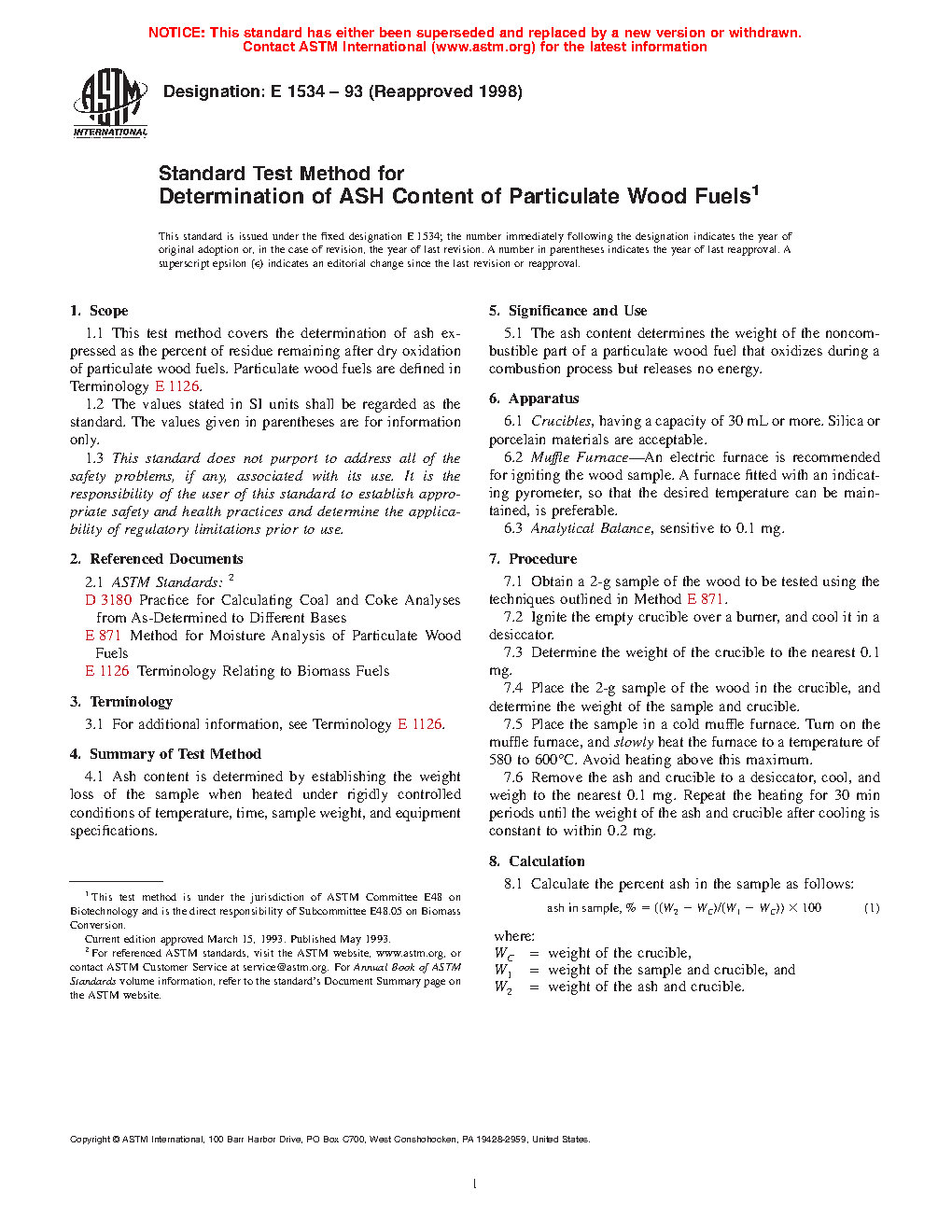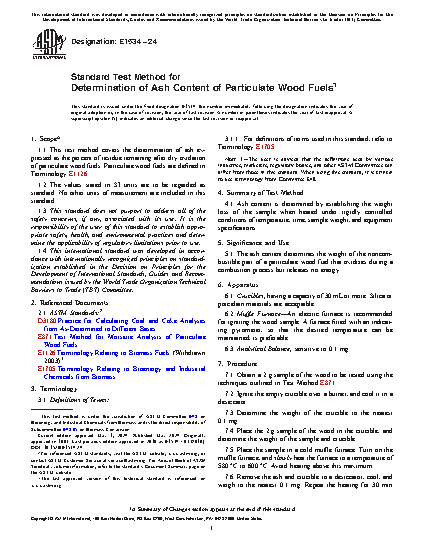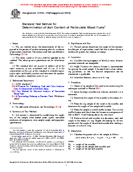 1.1 This test method covers the determination of ash expressed as the percent of residue remaining after dry oxidation of particulate wood fuels. Particulate wood fuels are defined in Terminology E1126.