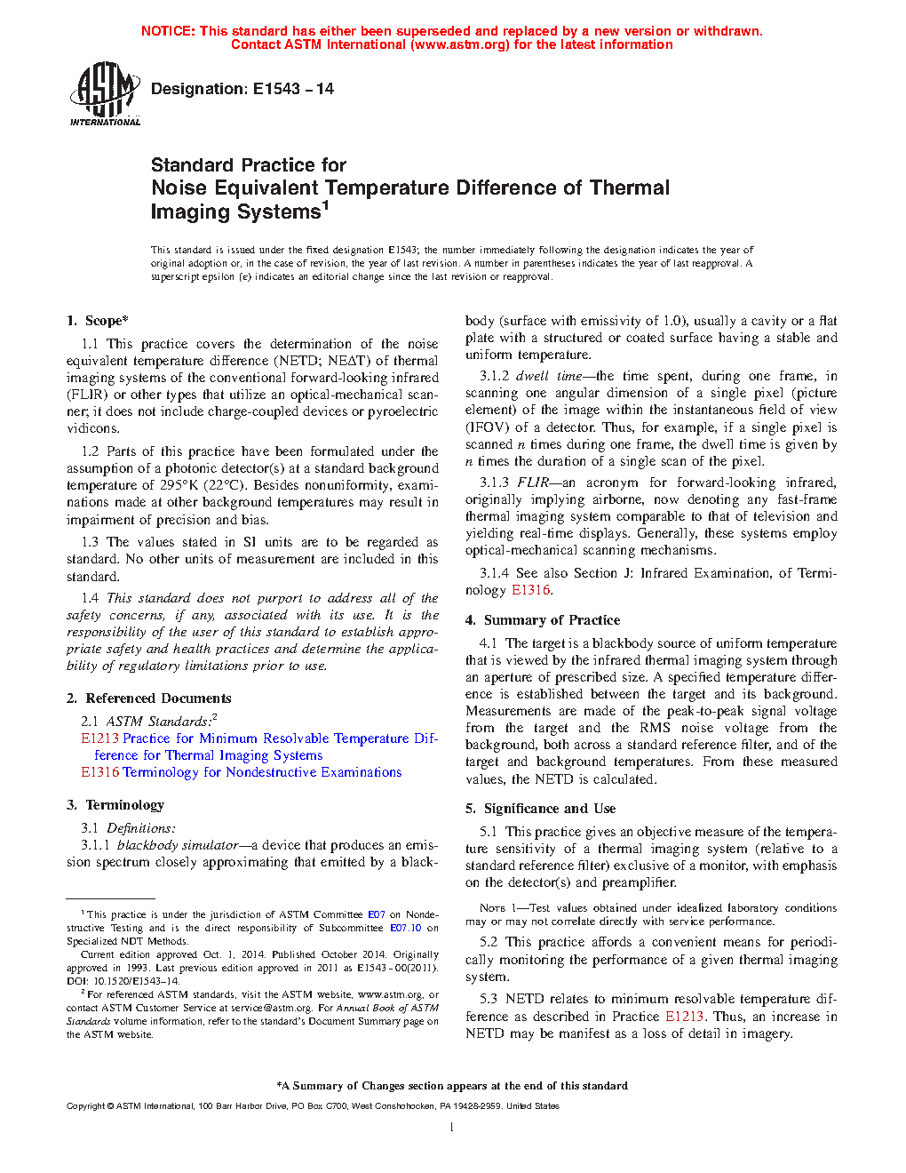 1.1 This test method covers the determination of the noise equivalent temperature difference (NETD; NE[delta]T) of thermal imaging systems of the conventional forward-looking infrared (FLIR) or other types that utilize an optical-mechanical scanner; it does not include charge-coupled devices or pyroelectric vidicons.