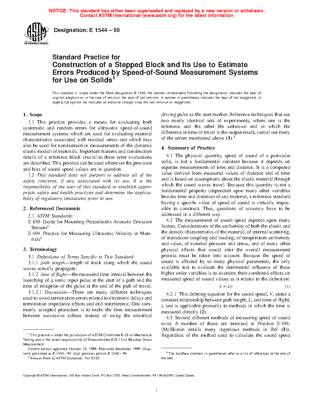 1.1 This practice provides a means for evaluating both systematic and random errors for ultrasonic speed-of-sound measurement systems which are used for evaluating material characteristics associated with residual stress and which may also be used for nondestructive measurements of the dynamic elastic moduli of materials. Important features and construction details of a reference block crucial to these error evaluations are described. This practice can be used whenever the precision and bias of sound speed values are in question.