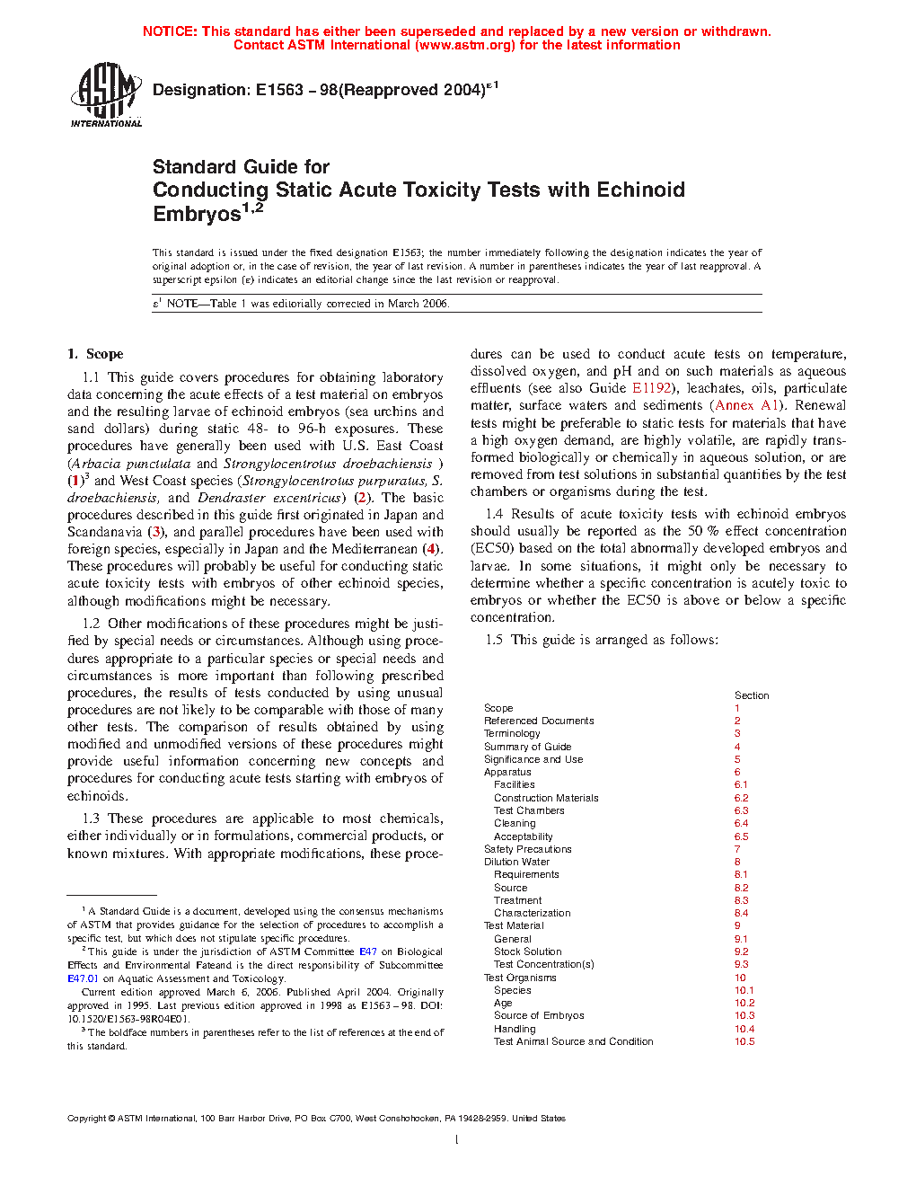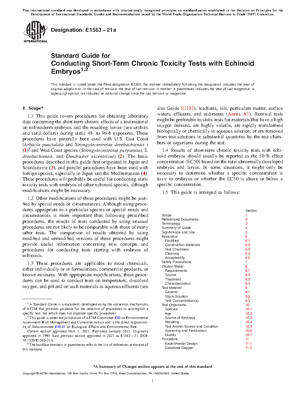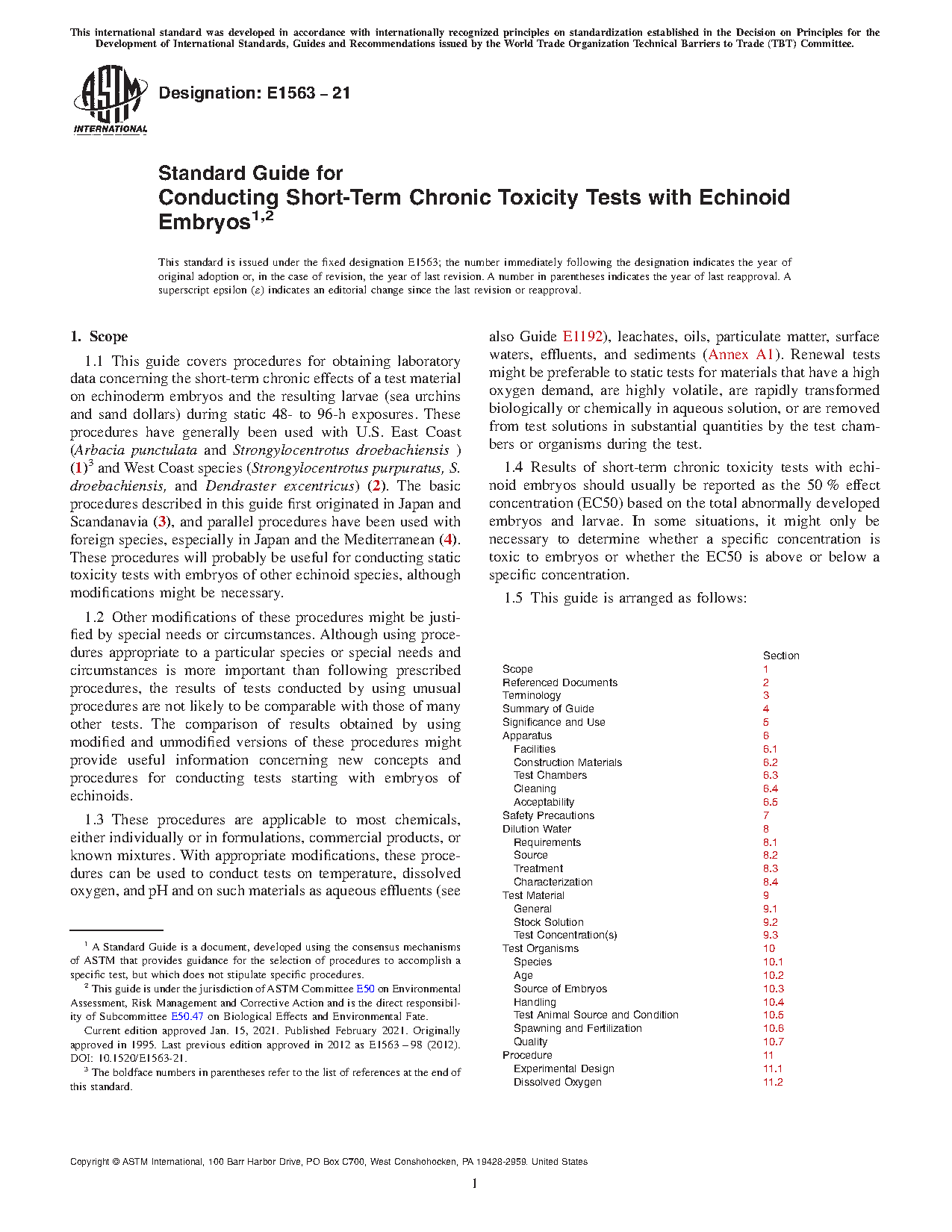 Section Scope 1 Referenced Documents 2 Terminology 3 Summary of Guide 4 Significance and Use 5 Apparatus 6 Facilities 6.1 Construction Materials 6.2 Test Chambers 6.3 Cleaning 6.4 Acceptability 6.5 Safety Precautions 7 Dilution Water 8 Requirements 8.1 Source 8.2 Treatment 8.3 Characterization 8.4 Test Material 9 General 9.1 Stock Solution 9.2 Test Concentration(s) 9.3 Test Organisms 10 Species 10.1 Age 10.2 Source of Embryos 10.3 Handling 10.4 Test Animal Source and Condition 10.5 Spawning and Fertilization 10.6 Quality 10.7 Procedure 11 Experimental Design 11.1 Dissolved Oxygen 11.2 Temperature 11.3 Beginning the Test 11.4 Feeding 11.5 Duration of Test 11.6 Biological Data 11.7 Control Performance 11.8 Other Measurements 11.9 Analytical Methods 12 Acceptability of Test 13 Calculation of Results 14 Report 15 Keywords 161.6 The values stated in SI units are to be regarded as the standard.