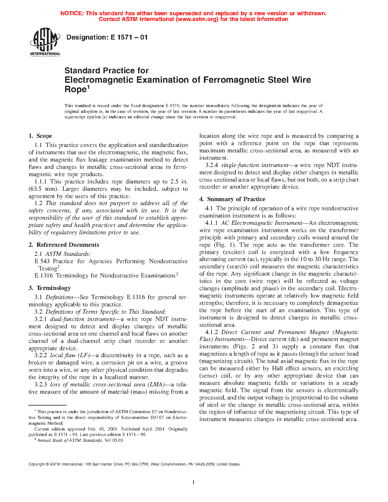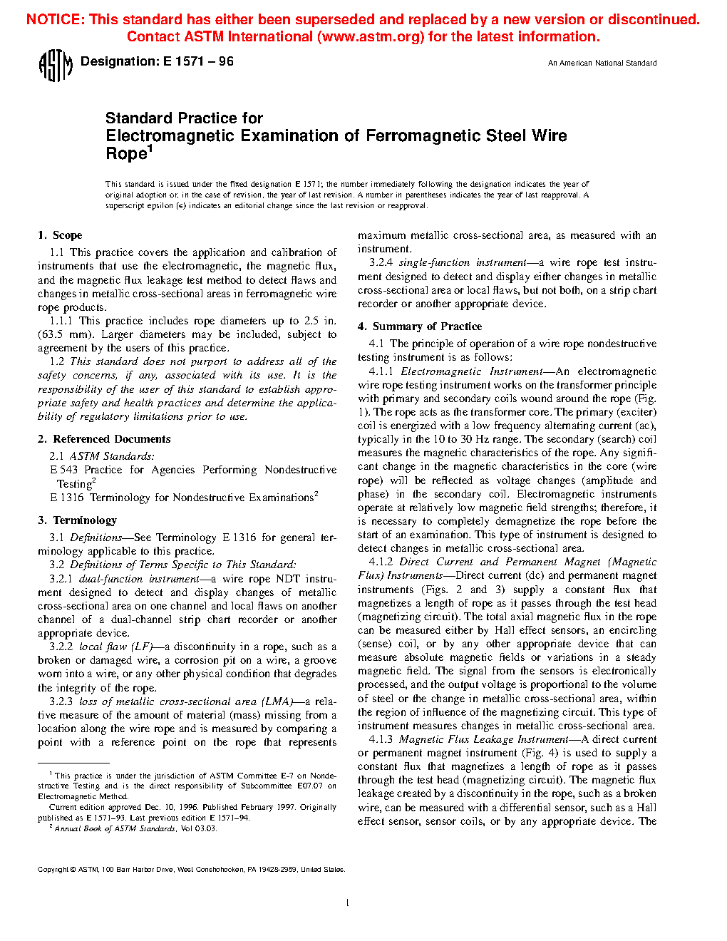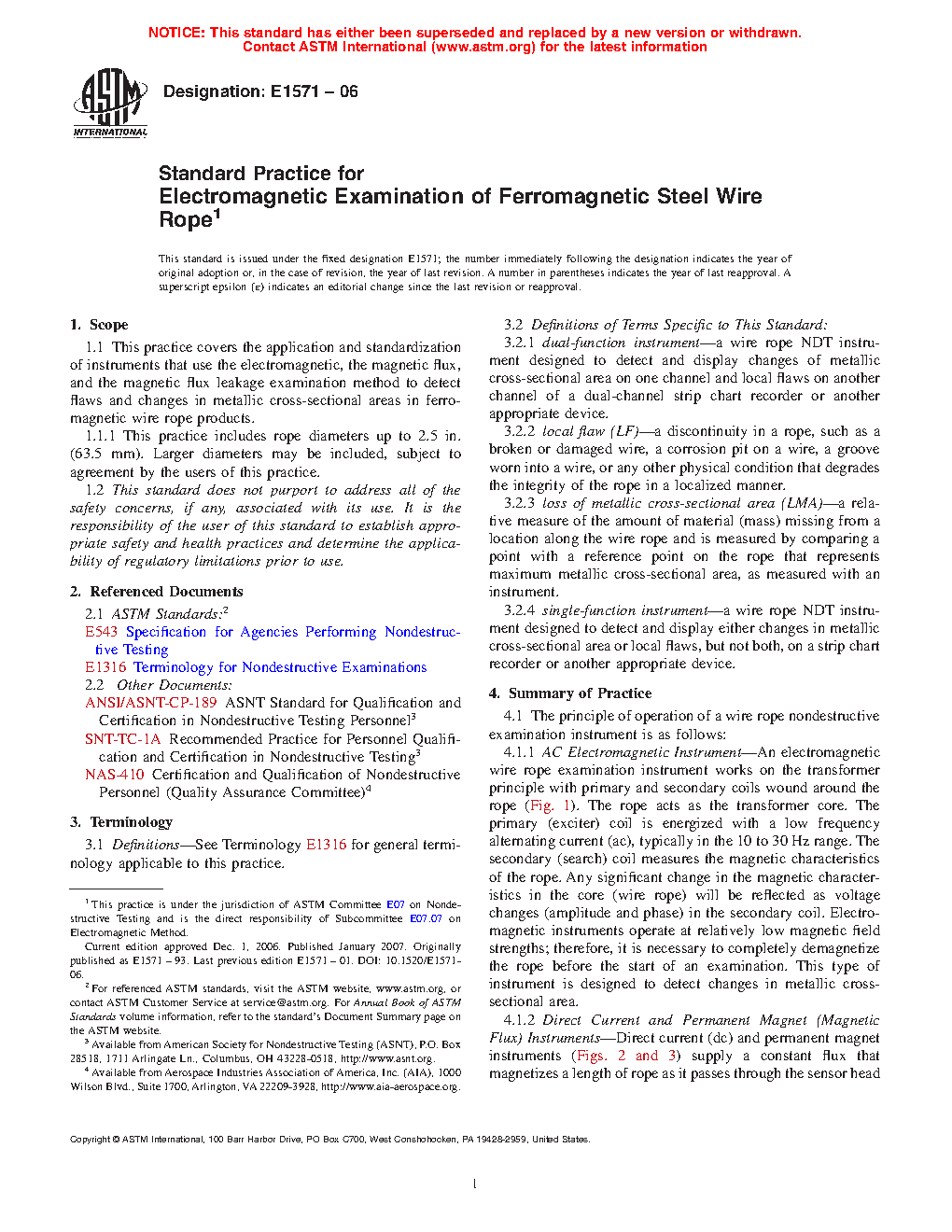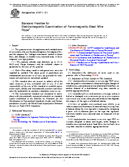 1.1 This practice covers the application and standardization of instruments that use the electromagnetic, the magnetic flux, and the magnetic flux leakage examination method to detect flaws and changes in metallic cross-sectional areas in ferromagnetic wire rope products.