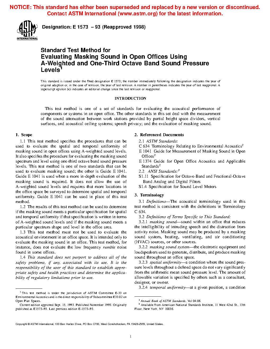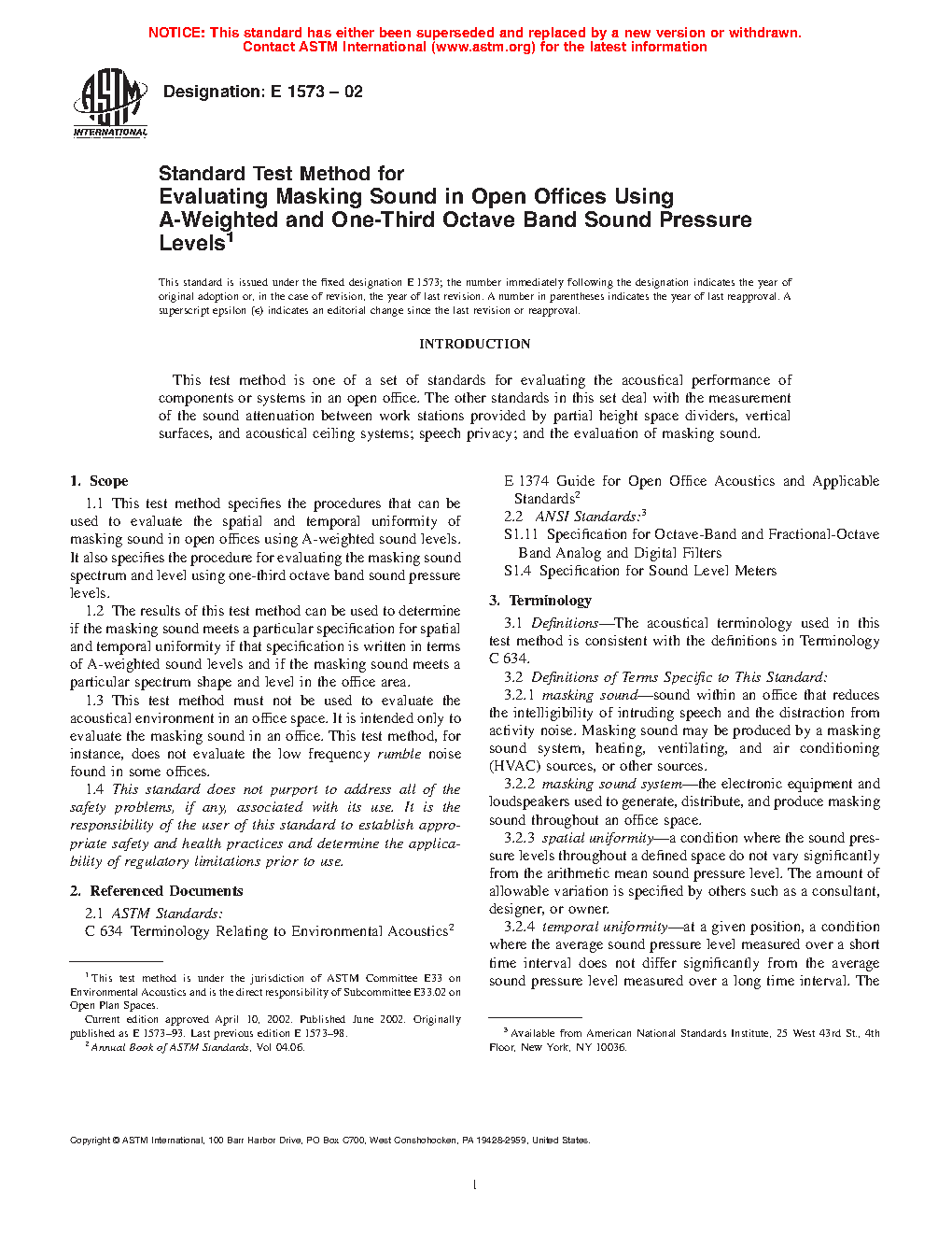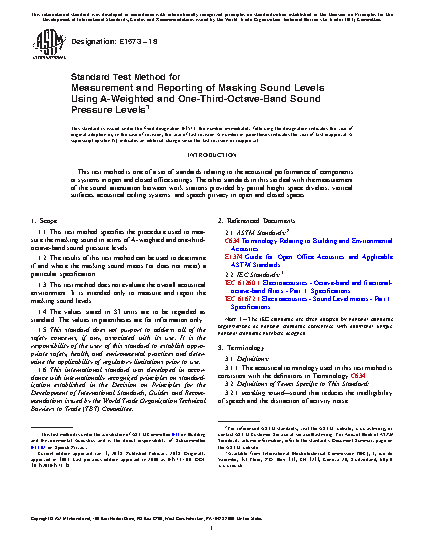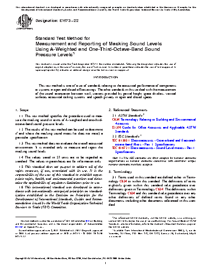 1.1 This test method specifies the procedures that can be used to evaluate the spatial and temporal uniformity of masking sound in open offices using A-weighted sound levels. It also specifies the procedure for evaluating the masking sound spectrum and level using one-third octave band sound pressure levels.