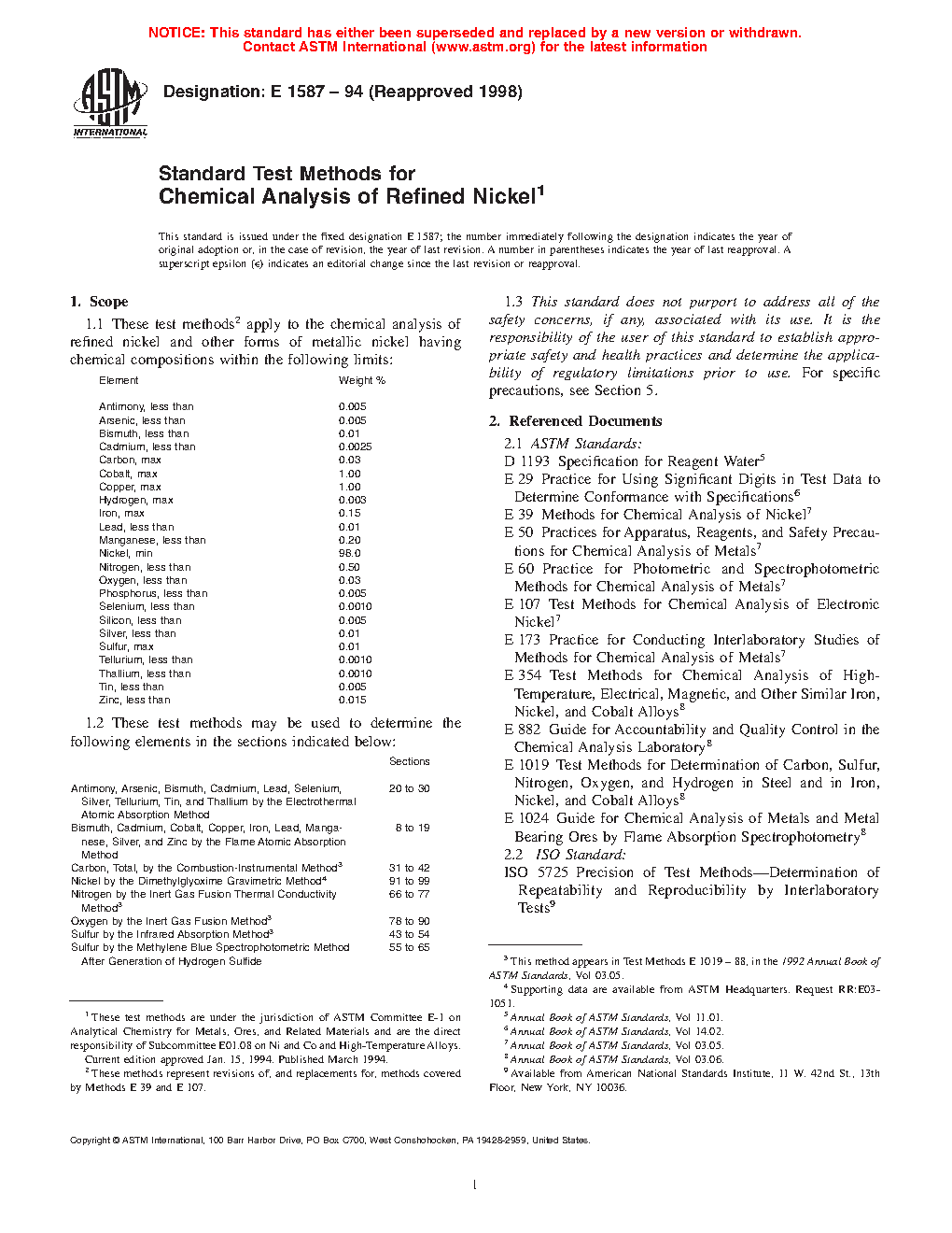 1.1 These test methods apply to the chemical analysis of refined nickel and other forms of metallic nickel having chemical compositions within the following limits: