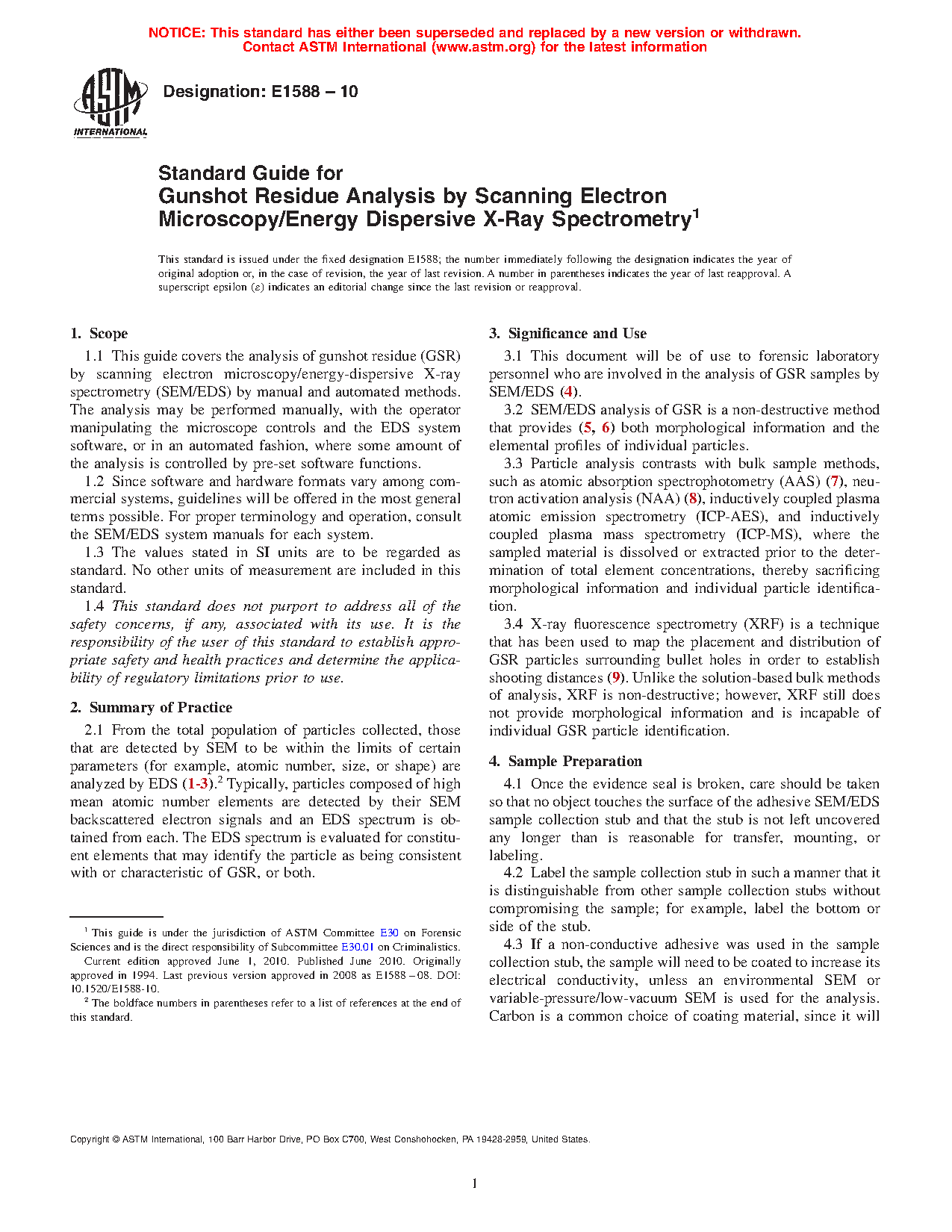 1.1 This practice covers the analysis of gunshot residue (GSR) by scanning electron microscopy/energy-dispersive X-ray spectrometry (SEM/EDS). The analysis is performed using automated software control of both the SEM and EDS systems, to screen the sample for candidate particles that could be associated with GSR. Manual control of the instrument is then used to perform confirmatory analysis and classification of the candidate particles. This practice refers solely to the analysis of electron microscopy stubs (1).2