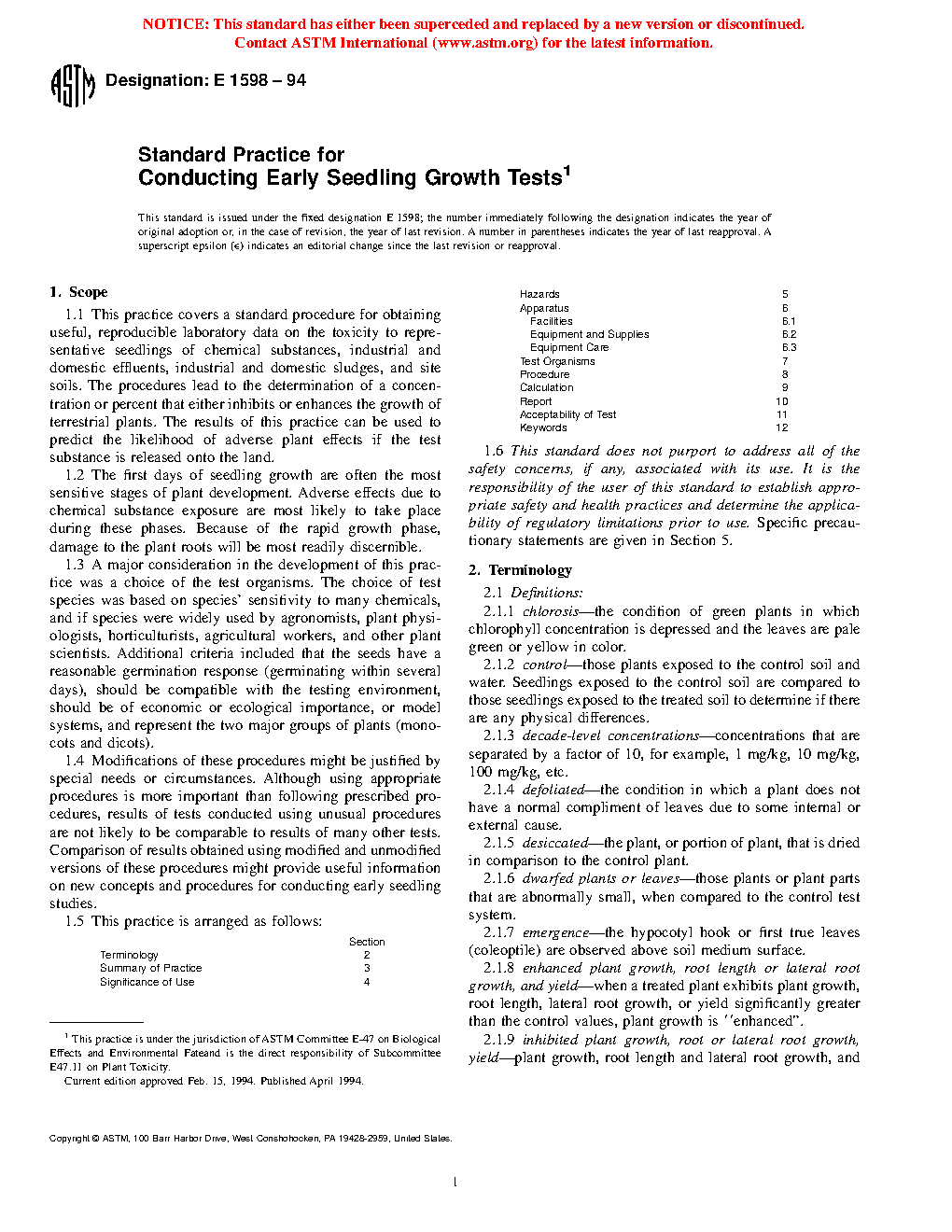Section Terminology 2 Summary of Practice 3 Significance of Use 4 Hazards 5 Apparatus 6 Facilities 6.1 Equipment and Supplies 6.2 Equipment Care 6.3 Test Organisms 7 Procedure 8 Calculation 9 Report 10 Acceptability of Test 11 Keywords 121.6 This standard does not purport to address all of the safety concerns, if any, associated with its use. It is the responsibility of the user of this standard to establish appropriate safety and health practices and determine the applicability of regulatory limitations prior to use. Specific precautionary statements are given in Section 6.