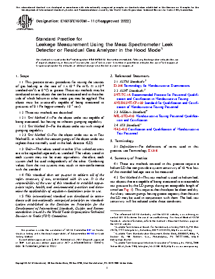 1.1 This practice covers procedures for testing the sources of gas leaking at the rate of 1 × 10 -8 Pa m3/s (1 × 10-9 standard-cm3/s at 0 °C) or greater. These test methods may be conducted on any object that can be evacuated and to the other side of which helium or other tracer gas may be applied. The object must be structurally capable of being evacuated to pressures of 0.1 Pa (approximately 10-3 torr).