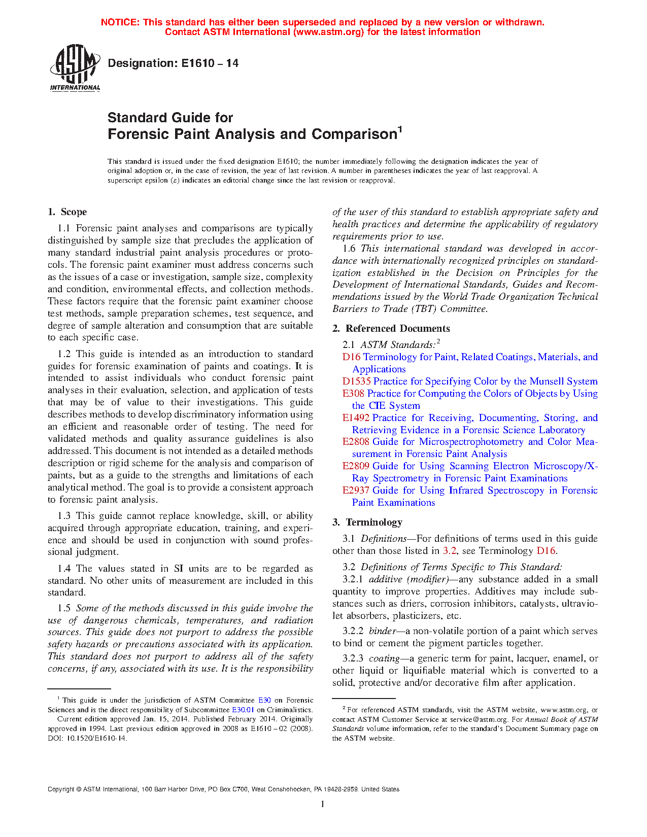 1.2 This guide is intended as an introduction to standard guides for forensic examination of paints and coatings. It is intended to assist individuals who conduct forensic paint analyses in their evaluation, selection, and application of tests that may be of value to their investigations. This guide describes methods to develop discriminatory information using an efficient and reasonable order of testing. The need for validated methods and quality assurance guidelines is also addressed. This document is not intended as a detailed methods description or rigid scheme for the analysis and comparison of paints, but as a guide to the strengths and limitations of each analytical method. The goal is to provide a consistent approach to forensic paint analysis.