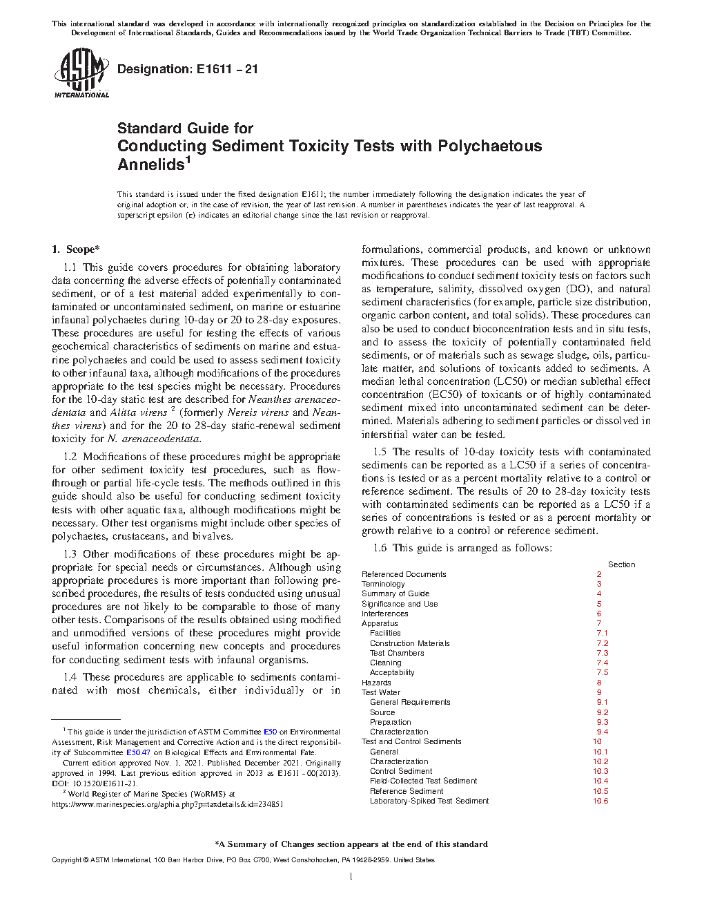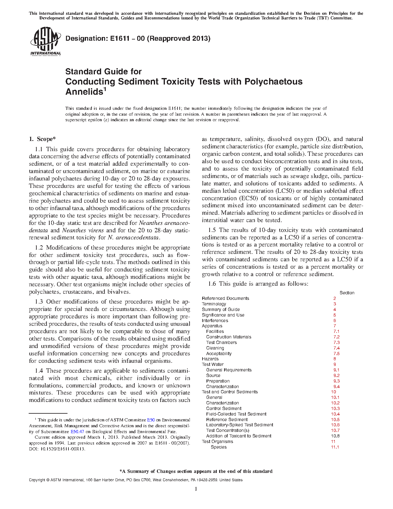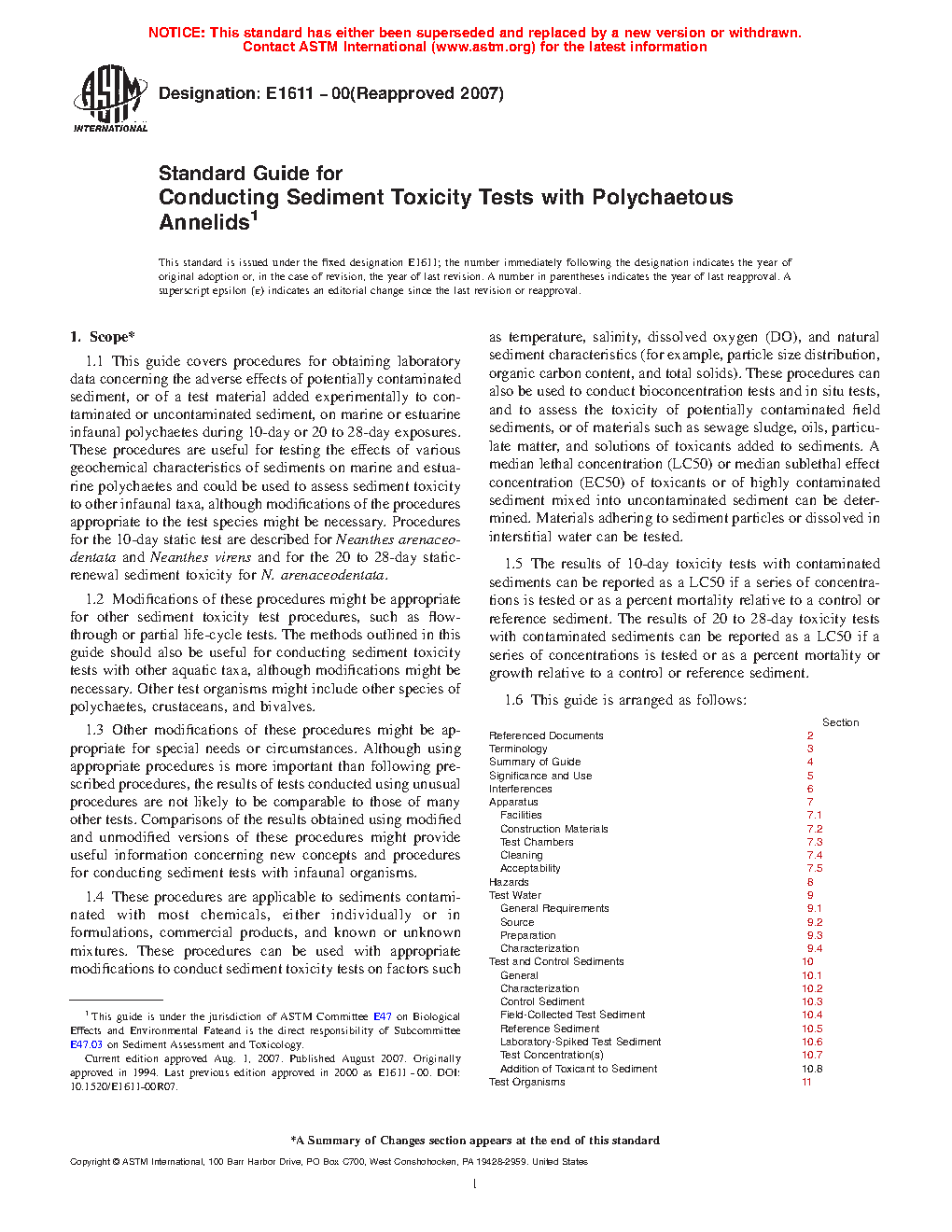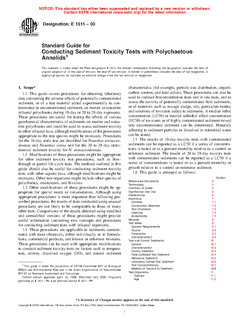 1.1 This guide covers procedures for obtaining laboratory data concerning the adverse effects of potentially contaminated sediment, or of a test material added experimentally to contaminated or uncontaminated sediment, on marine or estuarine infaunal polychaetes during 10-day or 20 to 28-day exposures. These procedures are useful for testing the effects of various geochemical characteristics of sediments on marine and estuarine polychaetes and could be used to assess sediment toxicity to other infaunal taxa, although modifications of the procedures appropriate to the test species might be necessary. Procedures for the 10-day static test are described for