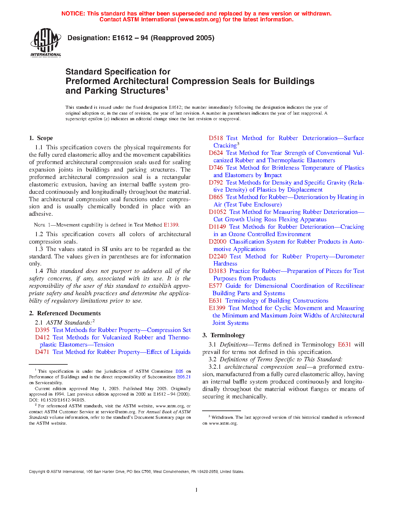 1.1 This specification covers the physical requirements for the fully cured elastomeric alloy and the movement capabilities of preformed architectural compression seals used for sealing expansion joints in buildings and parking structures. The preformed architectural compression seal is a rectangular elastomeric extrusion, having an internal baffle system produced continuously and longitudinally throughout the material. The architectural compression seal functions under compression and is usually chemically bonded in place with an adhesive.