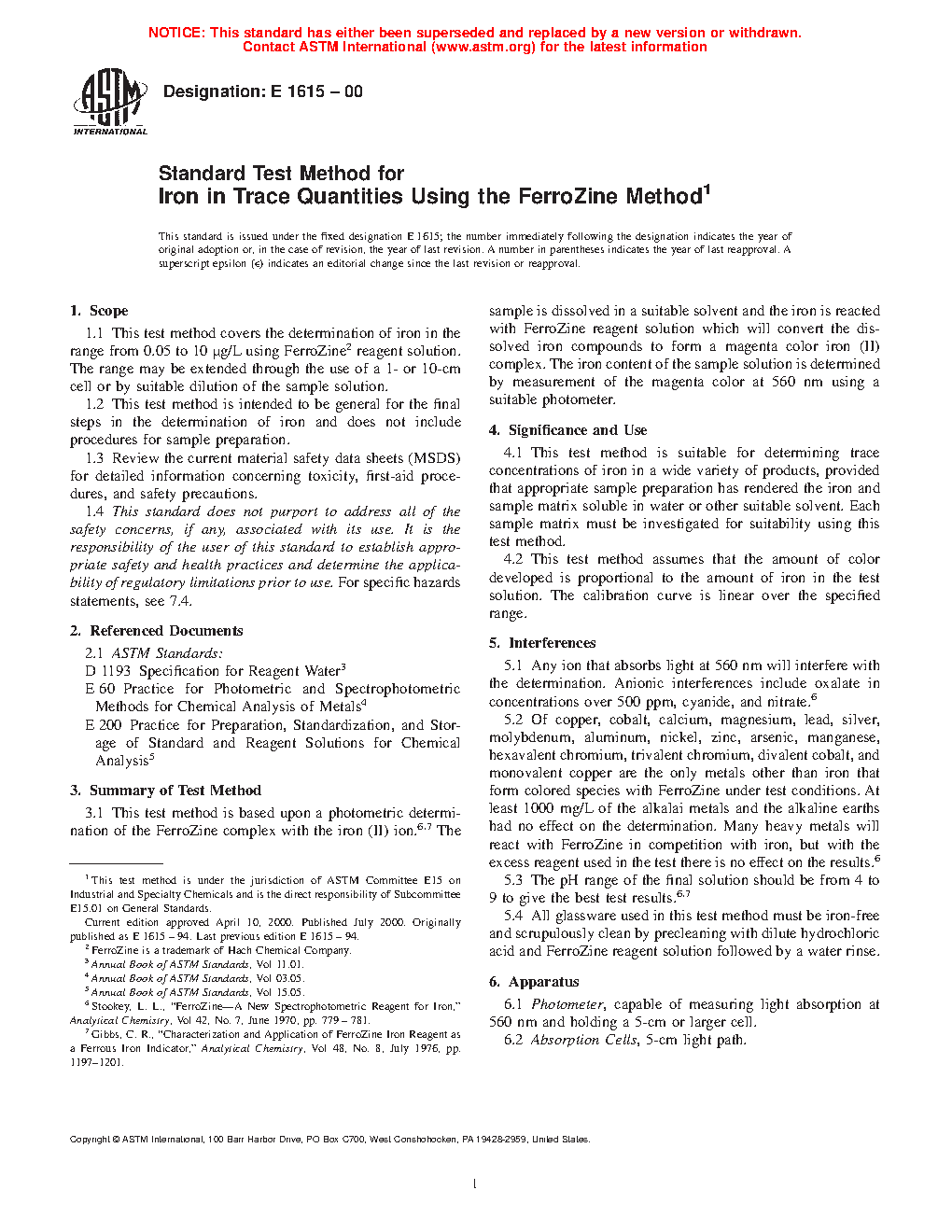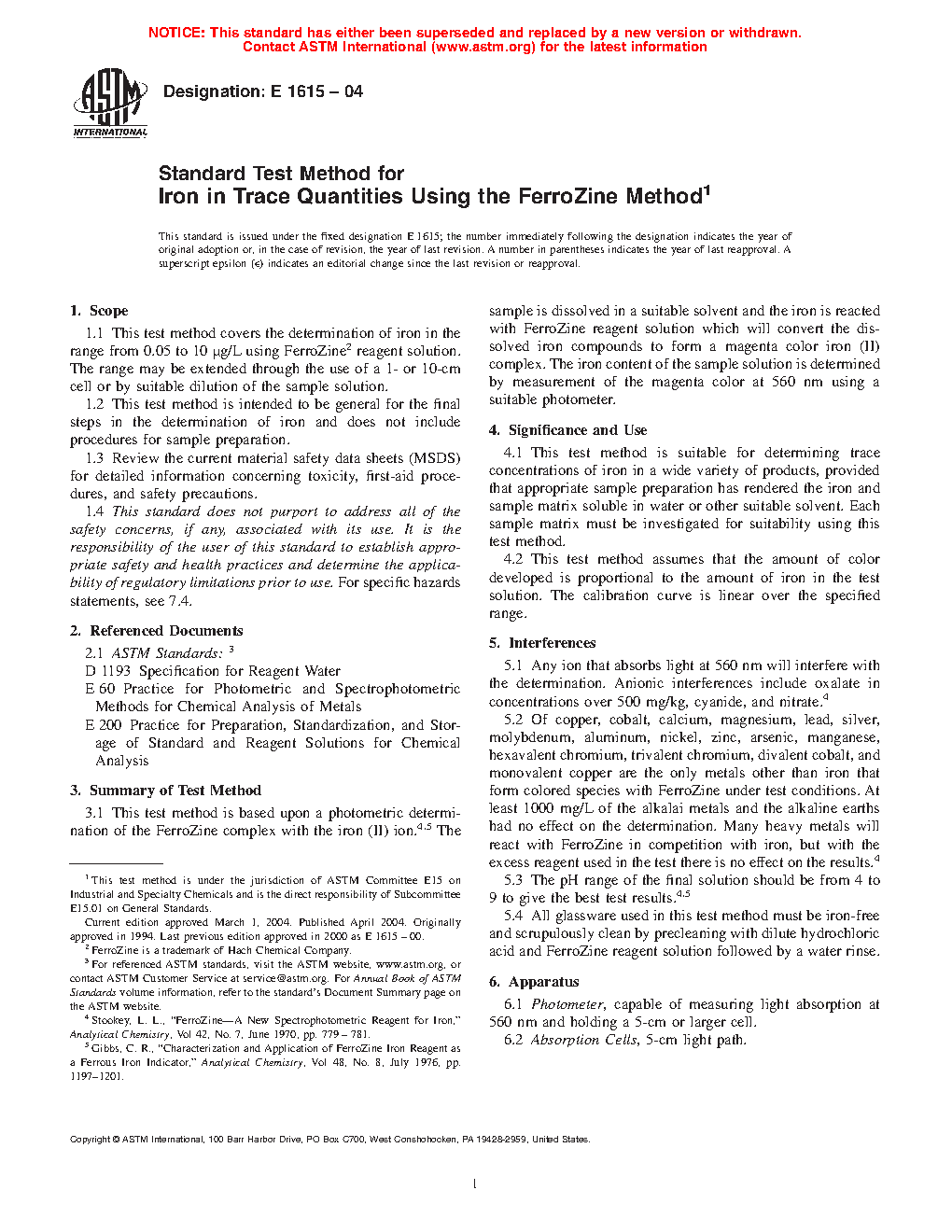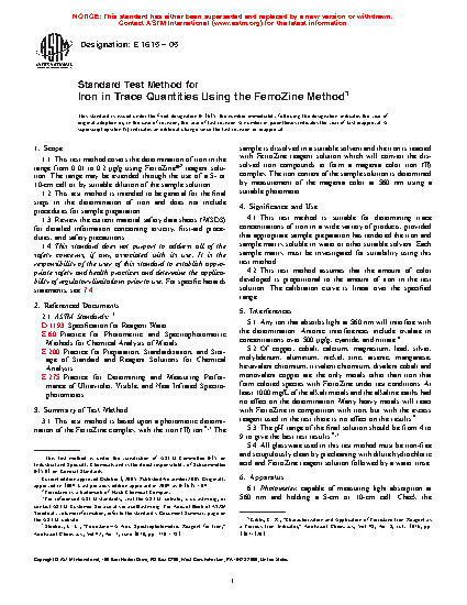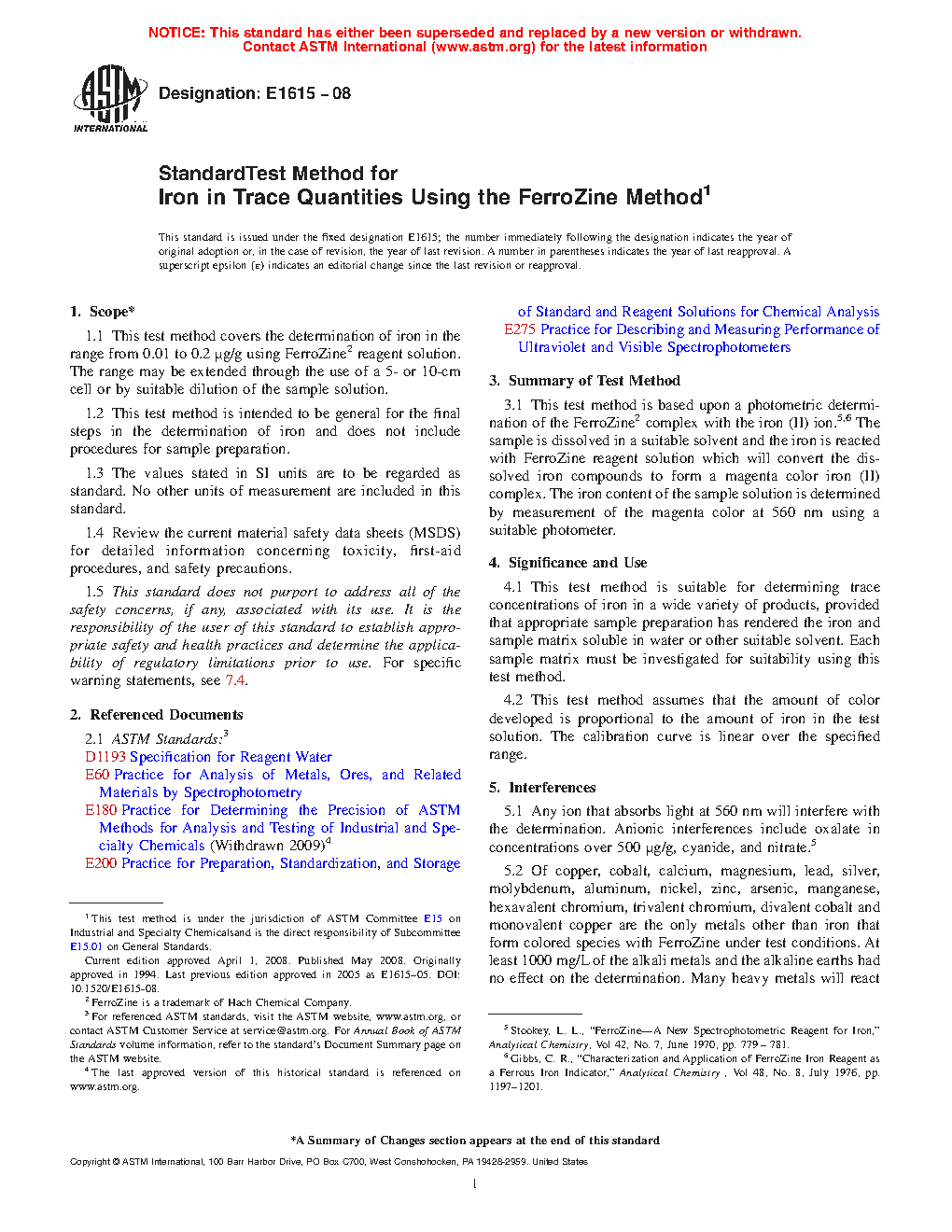 1.1 This test method covers the determination of iron in the range from 0.05 to 10 g/L using FerroZine reagent solution. The range may be extended through the use of a 1- or 10-cm cell or by suitable dilution of the sample solution.