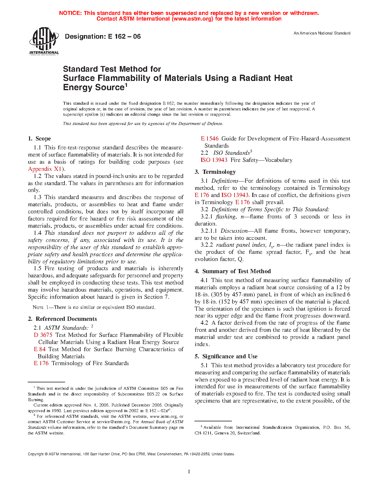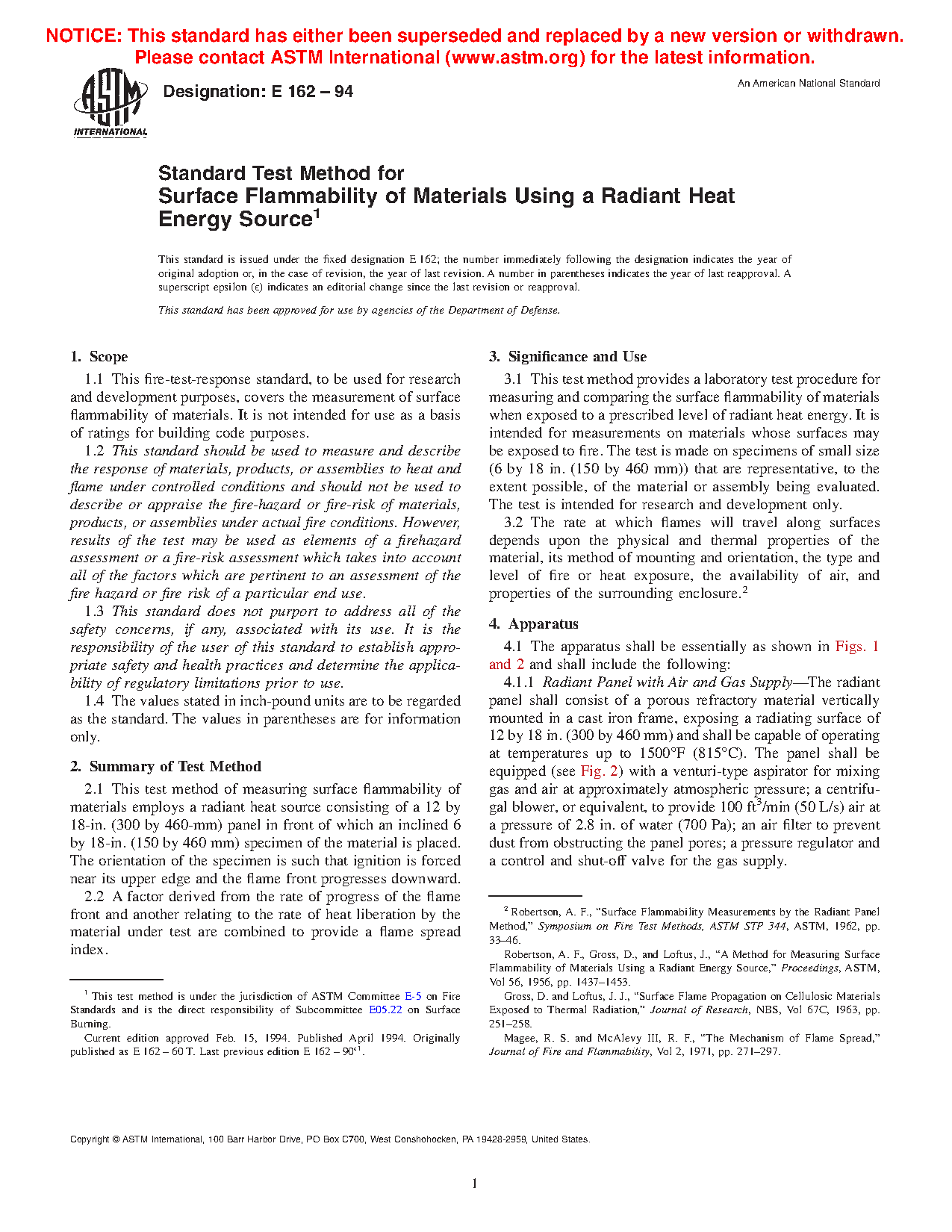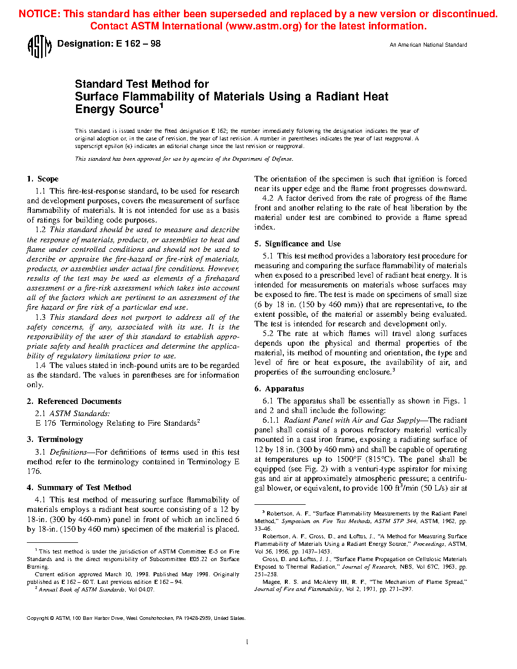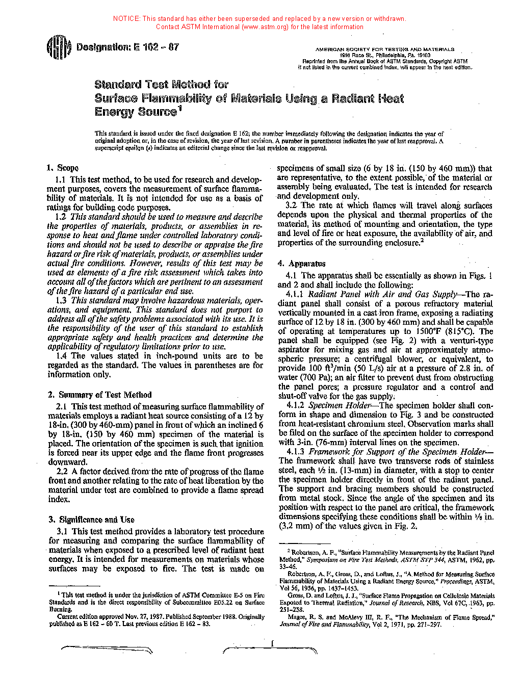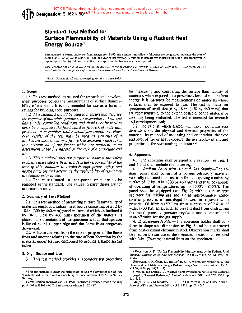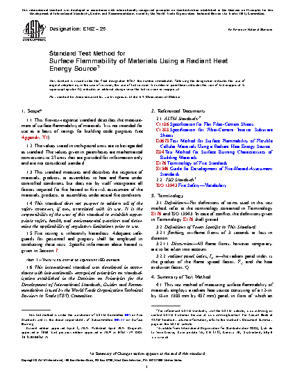 1.1 This fire-test-response standard describes the measurement of surface flammability of materials. It is not intended for use as a basis of ratings for building code purposes (see Appendix X1).