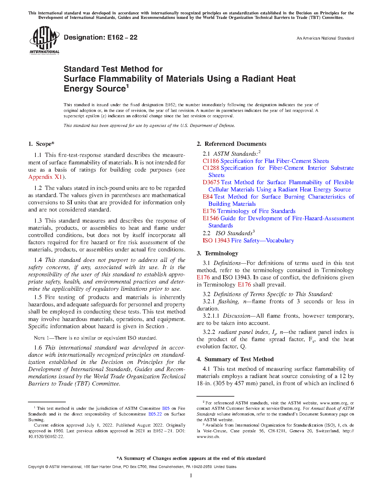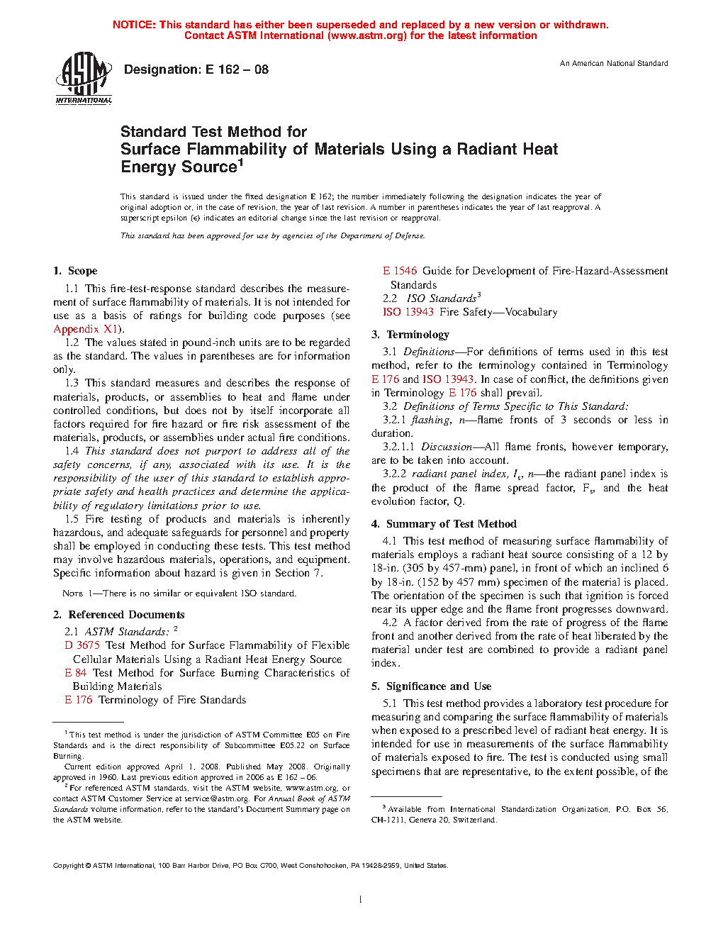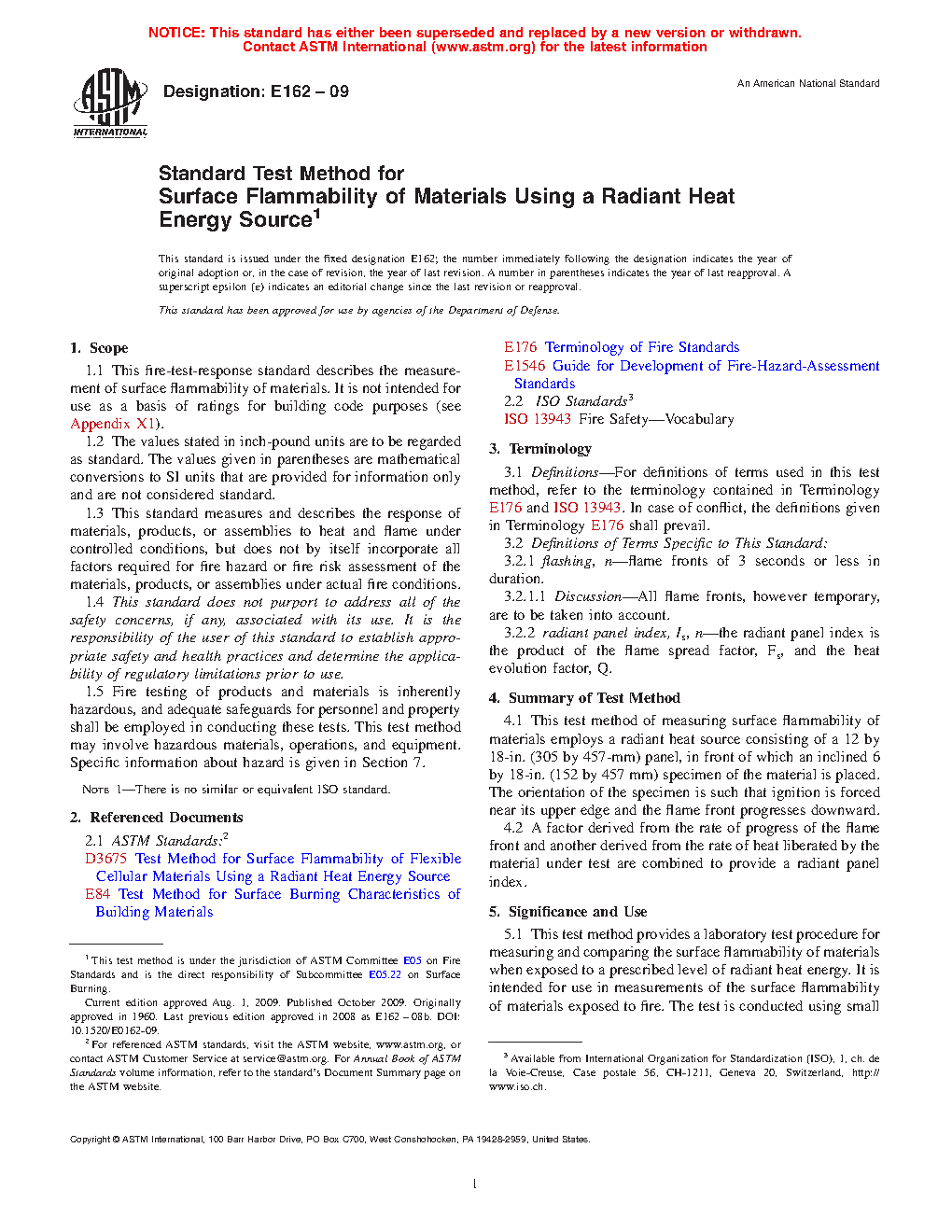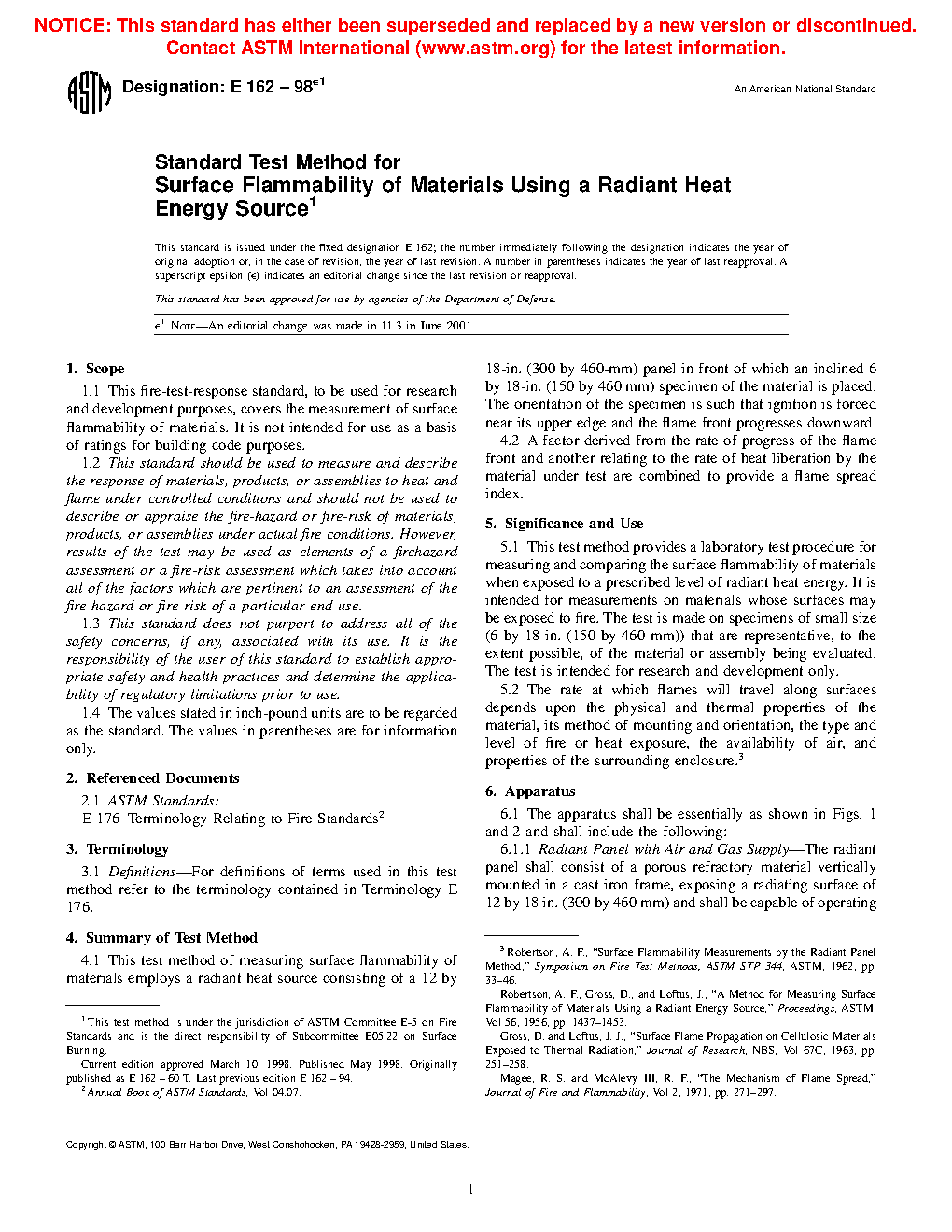 1.1 This fire-test-response standard describes the measurement of surface flammability of materials. It is not intended for use as a basis of ratings for building code purposes (see Appendix X1).